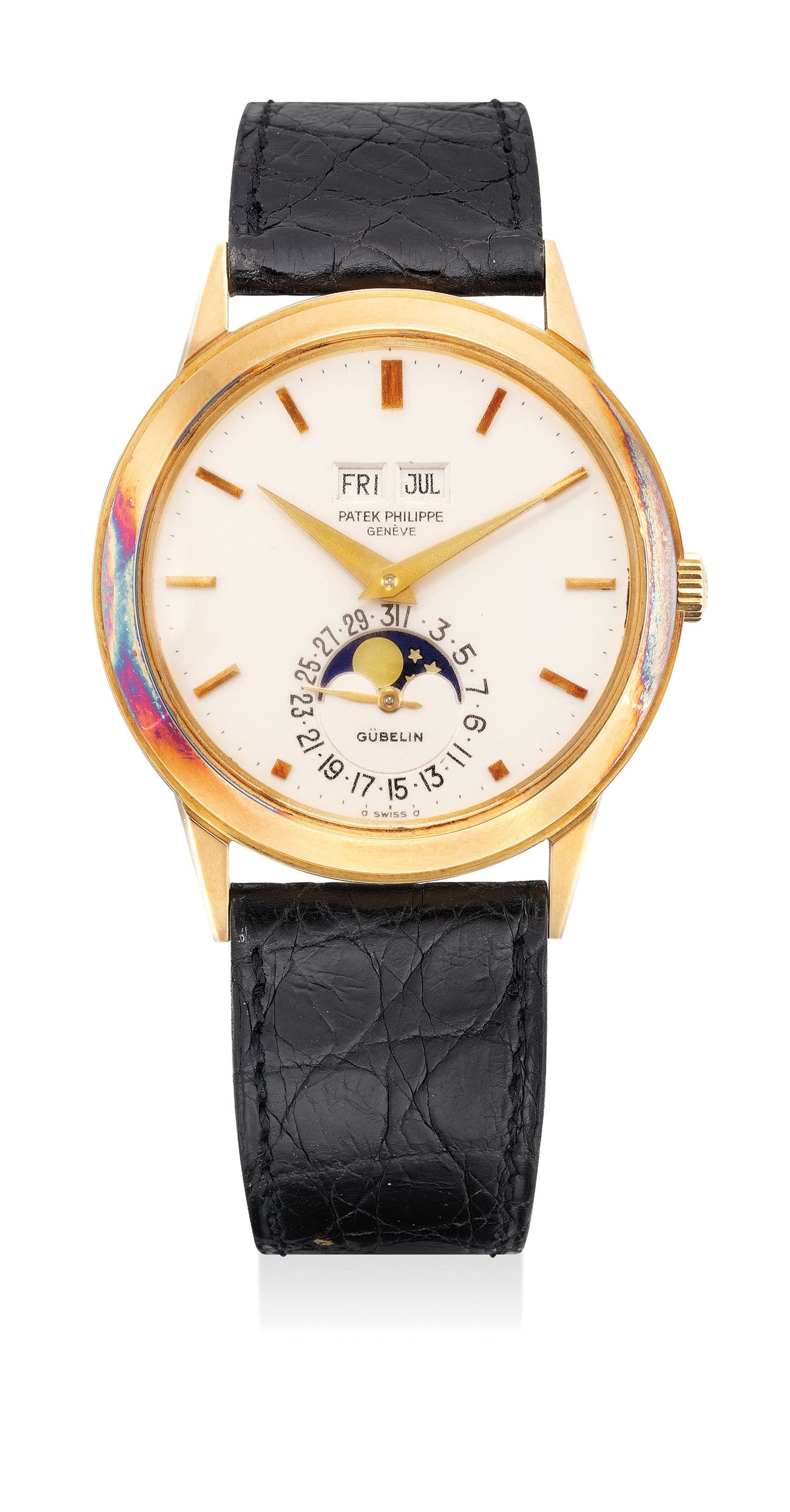 The connoisseur will immediately notice the superb condition of the piece, its case covered with a strong layer of oxidation indicating years spent in a safety deposit box. Once the watch is turned, not the usual one or two, but astoundingly four perfectly crisp hallmarks - including the one on the caseback, an obviously very sensitive location - greet and delight the beholder. Finally, its appeal and collectability are boosted to a superior level by the presence of the Gübelin signature, one of the most respected watch retailers in Switzerland. Co-signed pieces are an extremely rare find and are equally coveted by collectors; in conjunction with the superb condition, the co-signature makes this example a “trophy watch” which will be treasure and delight of its new owner for years to come.
