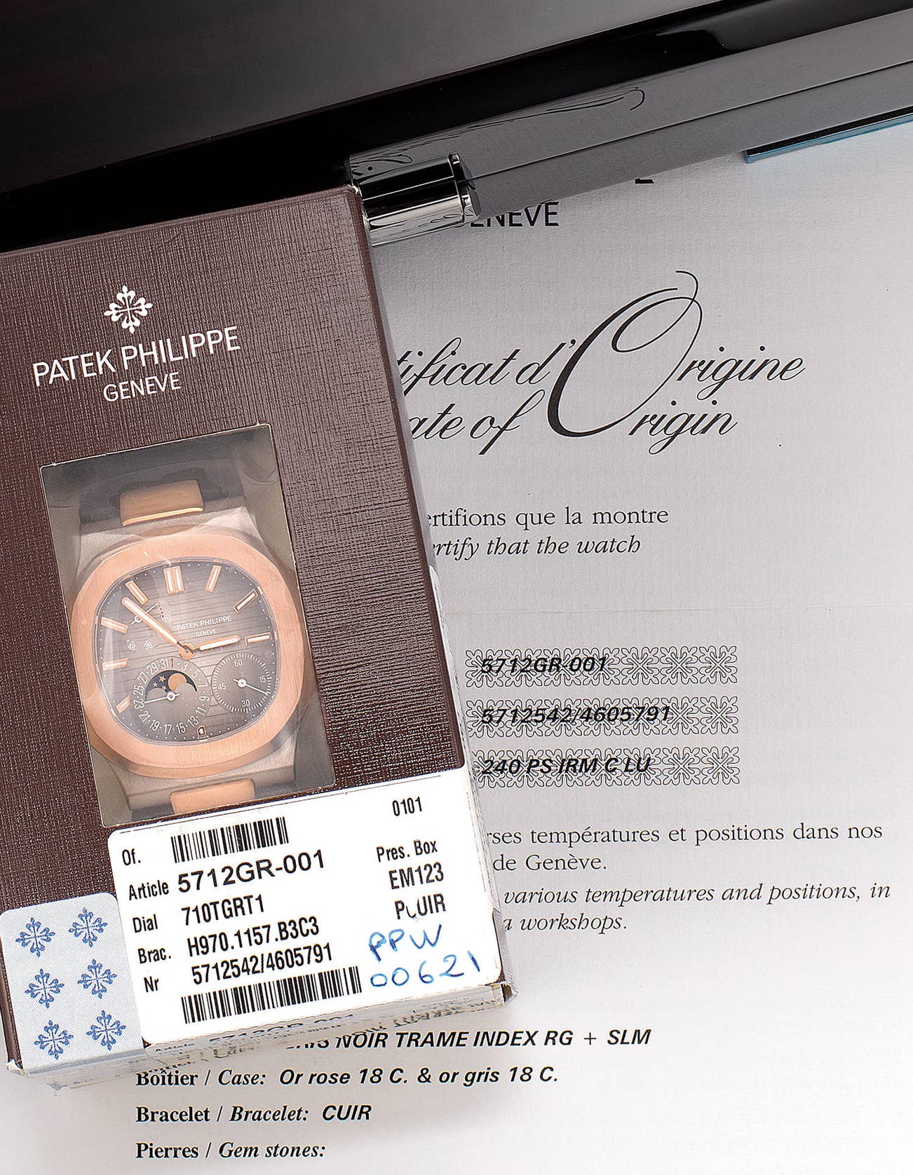 百達翡麗,型號5712GR-001,非常精細,18K白金和玫瑰金自動上弦腕錶,配日期、月相和動力儲存,特為香港市場限量發行,約2013年製。附錶盒、原裝證書、調整筆 原廠雙封全新品