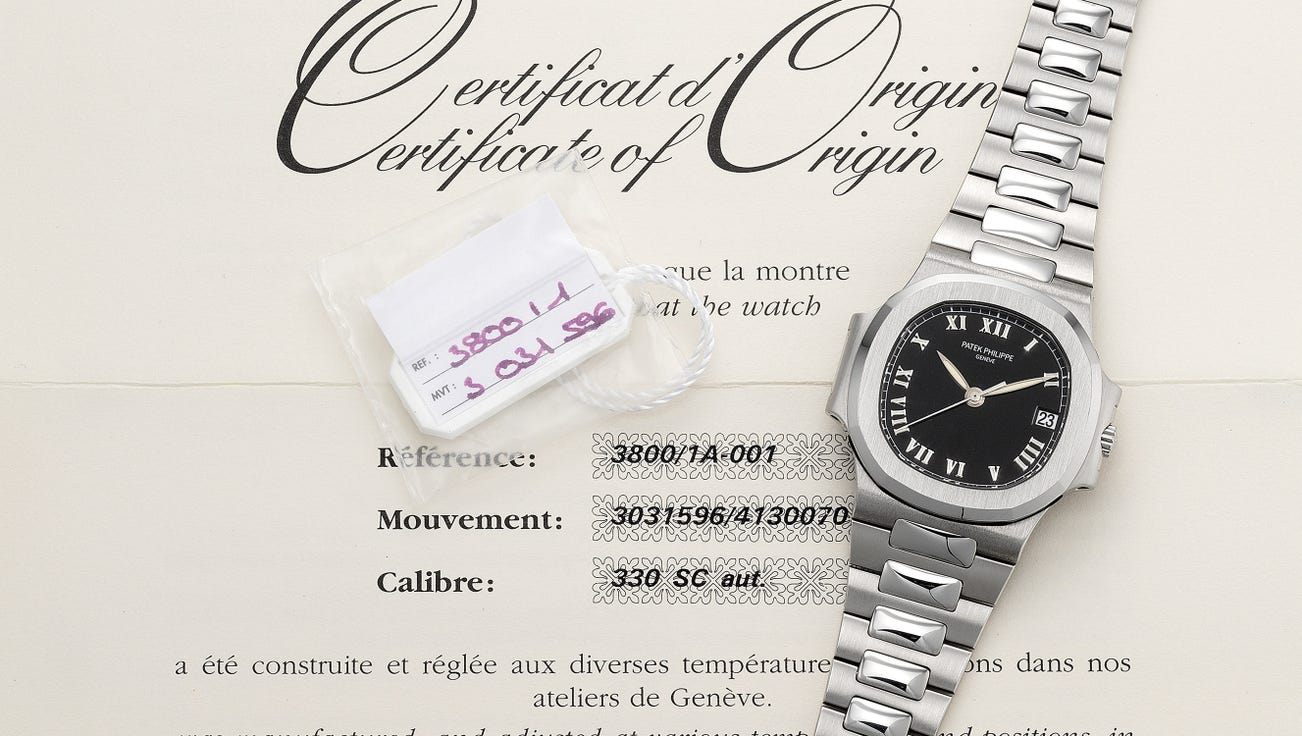百達翡麗,「Nautilus」型號3800/1A,罕有及精細,精鋼自動上弦鏈帶腕錶,配罕有中心秒針和日期顯示,2001年製。附原裝證書、錶盒和後補證書