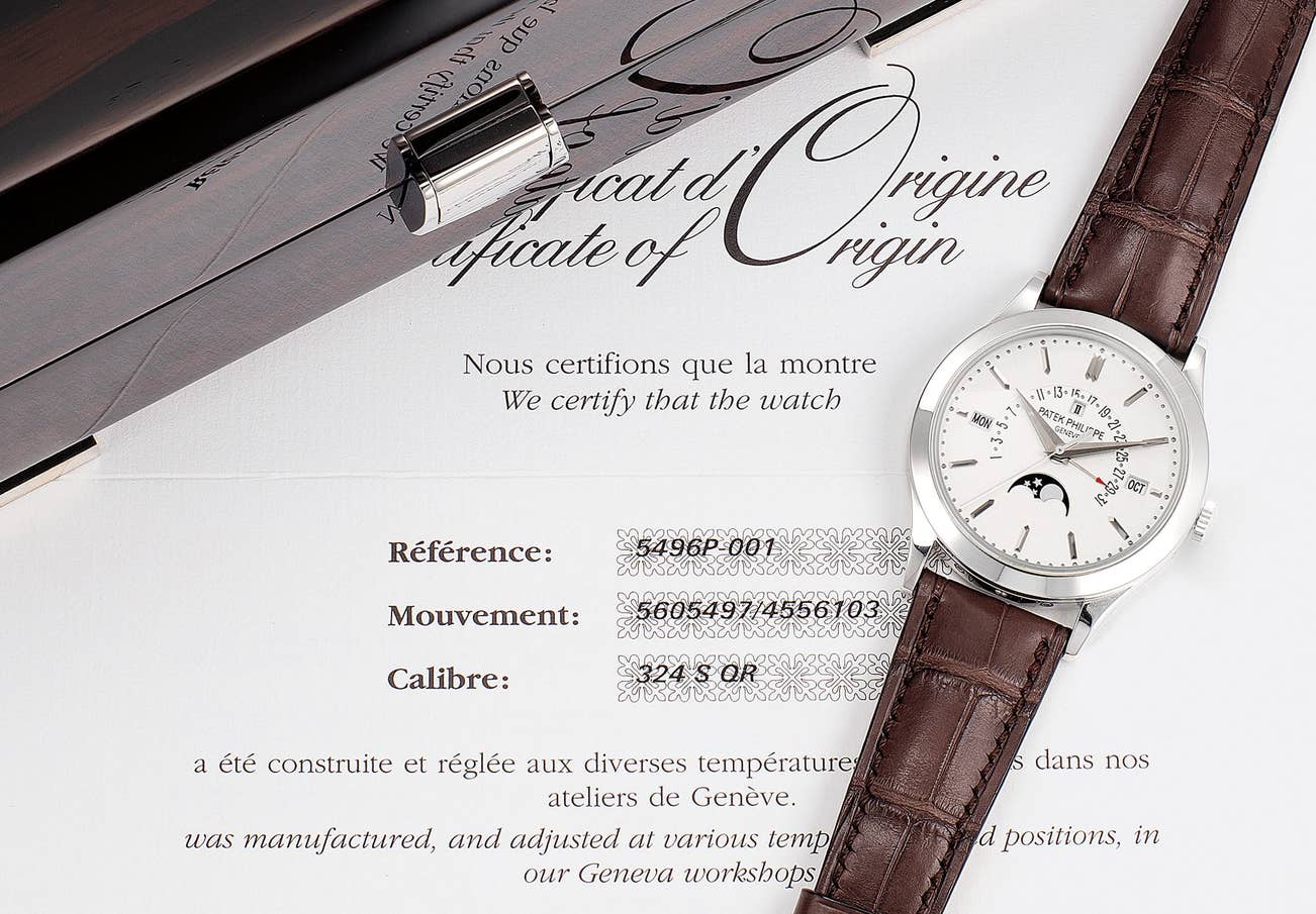 百達翡麗,型號5496P-001,精細,鉑金自動上弦腕錶,配萬年曆、逆跳日期、中心秒針、閏年和月相,2011年製。附錶盒、原裝證書