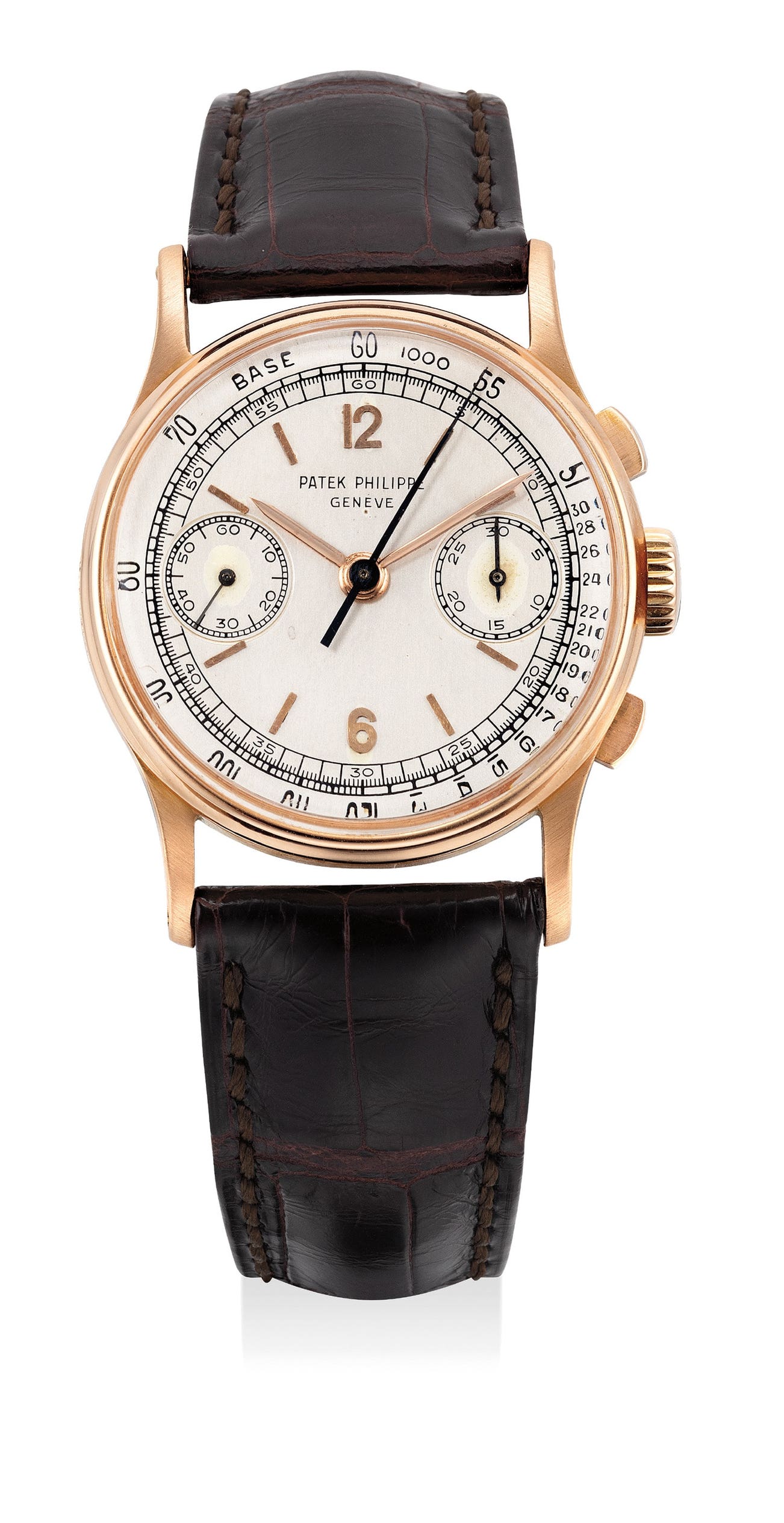 百達翡麗,型號130,精細及罕有,18K玫瑰金腕錶,配計時功能及設速圈刻度,1947年製。附後補證書和錶盒