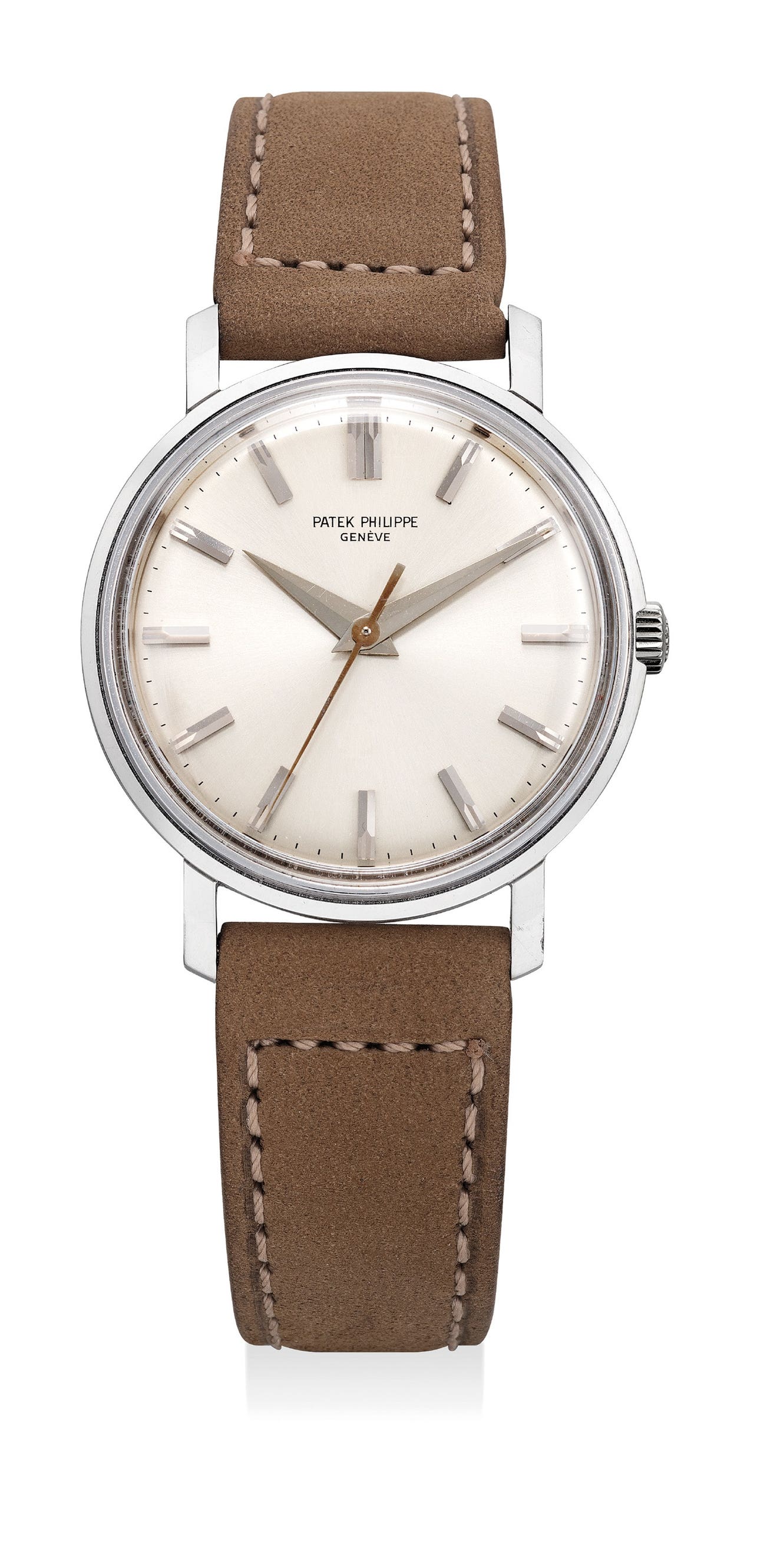 百達翡麗,型號3504,非常罕有,18K白金大三針腕錶,1963年製。附錶盒、原裝證書 百達翡麗型號3504,僅非常短暫於1963年至1964年兩年間生產,至今只有4枚資料存世。值得一提的是,歷年來的百達翡麗零售清單上,從來沒有提到百達翡麗型號3504的18K版本,或零售價格資料,專家學者相信為非一般常規的訂製款式,十分珍罕。