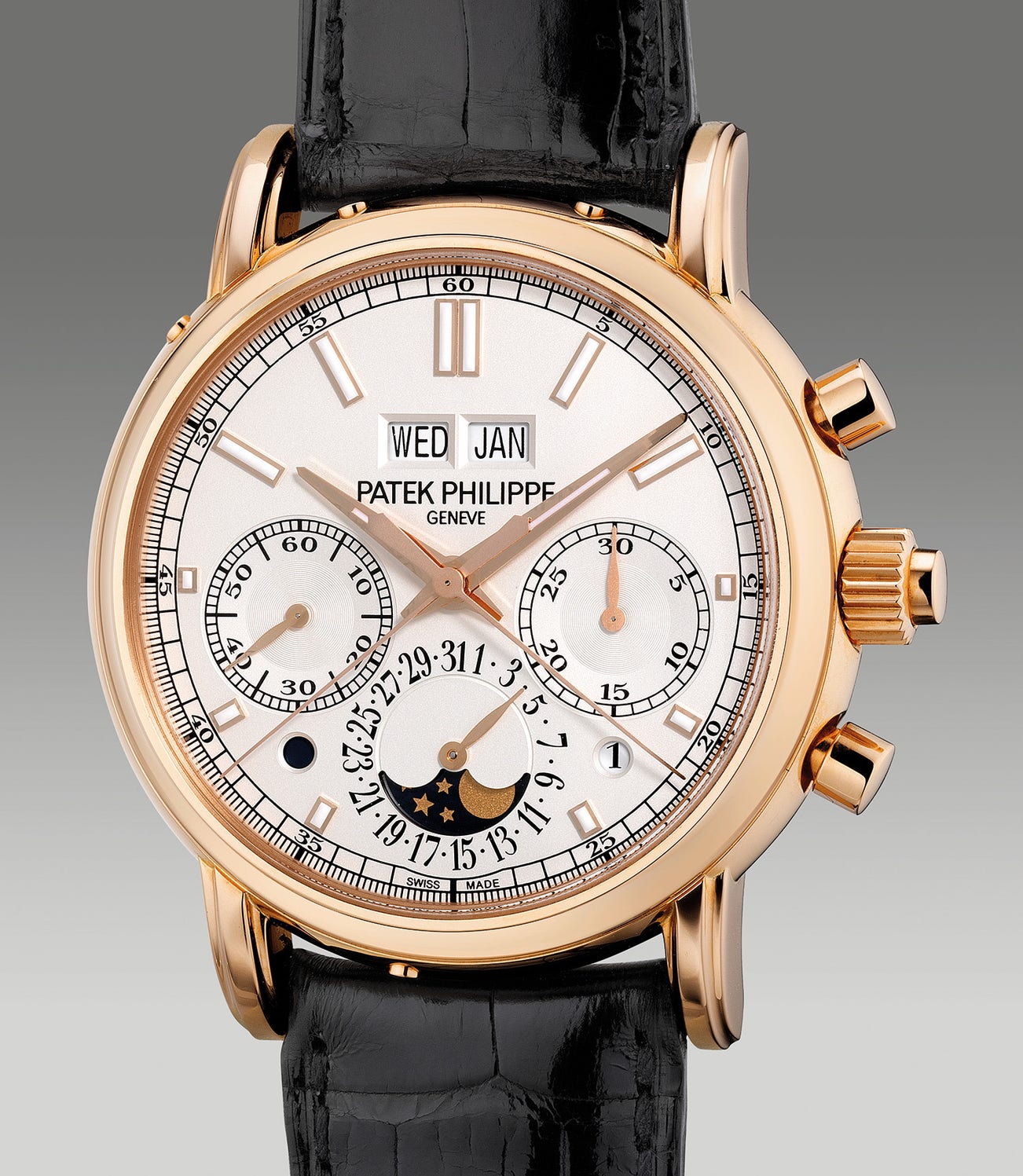 In 2012, Patek Philippe introduced another milestone timepiece replacing the former coveted ref. 5004. The new ref. 5204 featured important upgrades such as Patek Philippe’s first in-house perpetual calendar split seconds chronograph caliber CHR 29-535 PS Q as well as adopting a new and enlarged case measuring 40mm. While the idea of the dial remains very similar, minor alignment adjustments were made for the registers providing the wearer greater legibility of the dial and indications. Furthermore, the moon phases have been placed “upside down”. The indexes have been upgraded to baton instead of the previous applied Arabic numerals. Initially launched in platinum for the first four years of the release, the pink gold variant was launched in 2016, with a clean silvery white dial.