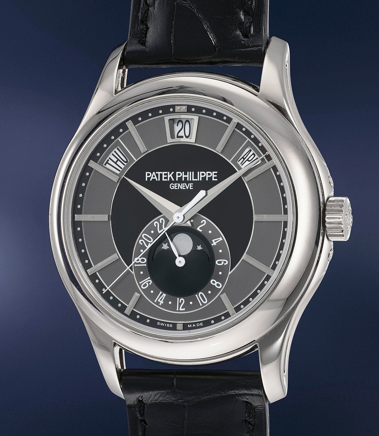 A highly rare and attractive white gold annual calendar wristwatch with moonphases, certificate of origin and presentation box