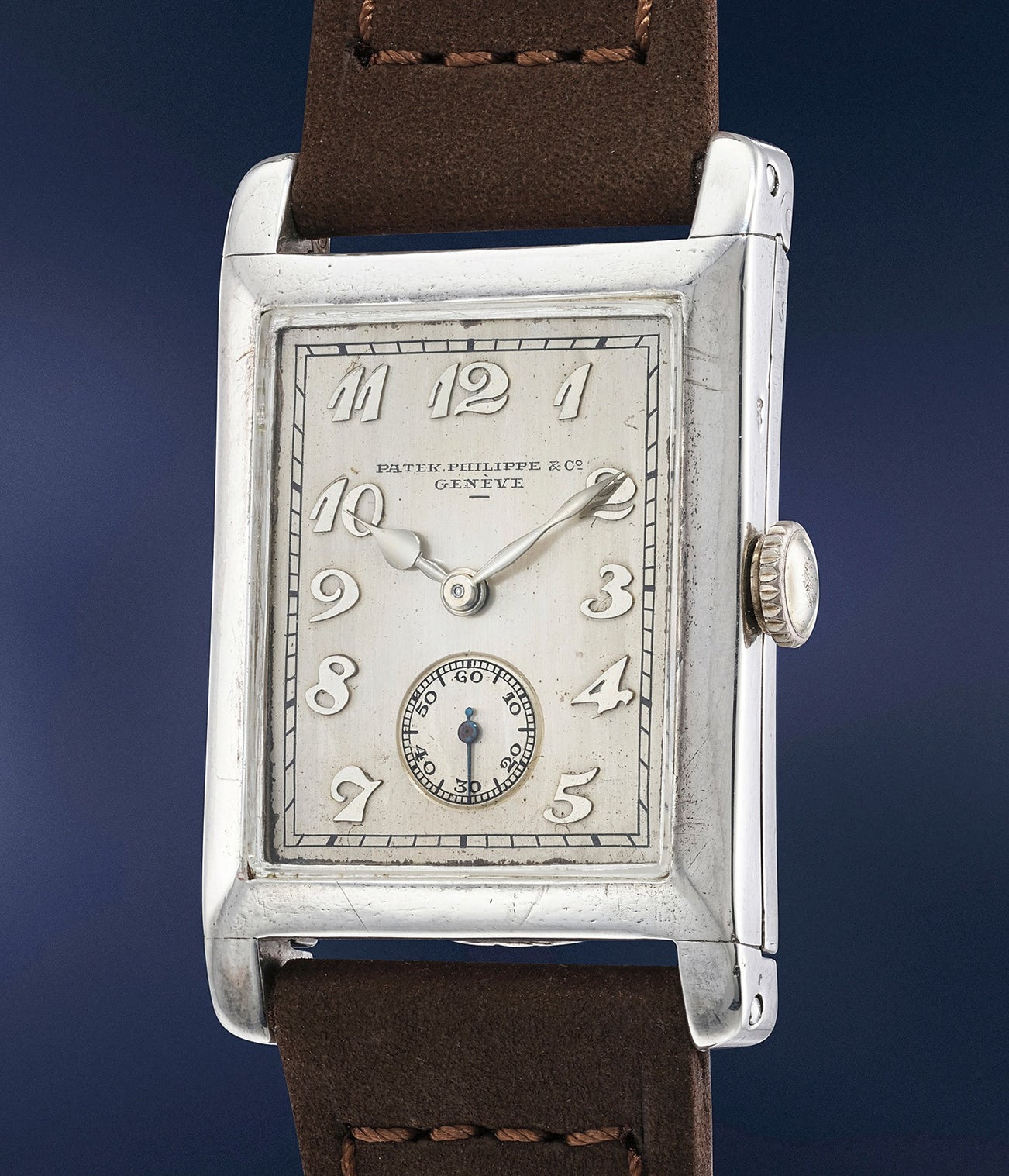 Accompanied by Patek Philippe Extract form the Archives confirming production of the present watch with tortoise-shaped case, silvered dial and raised Breguet numerals in white gold in 1930 and its subsequent sale on July 30, 1930