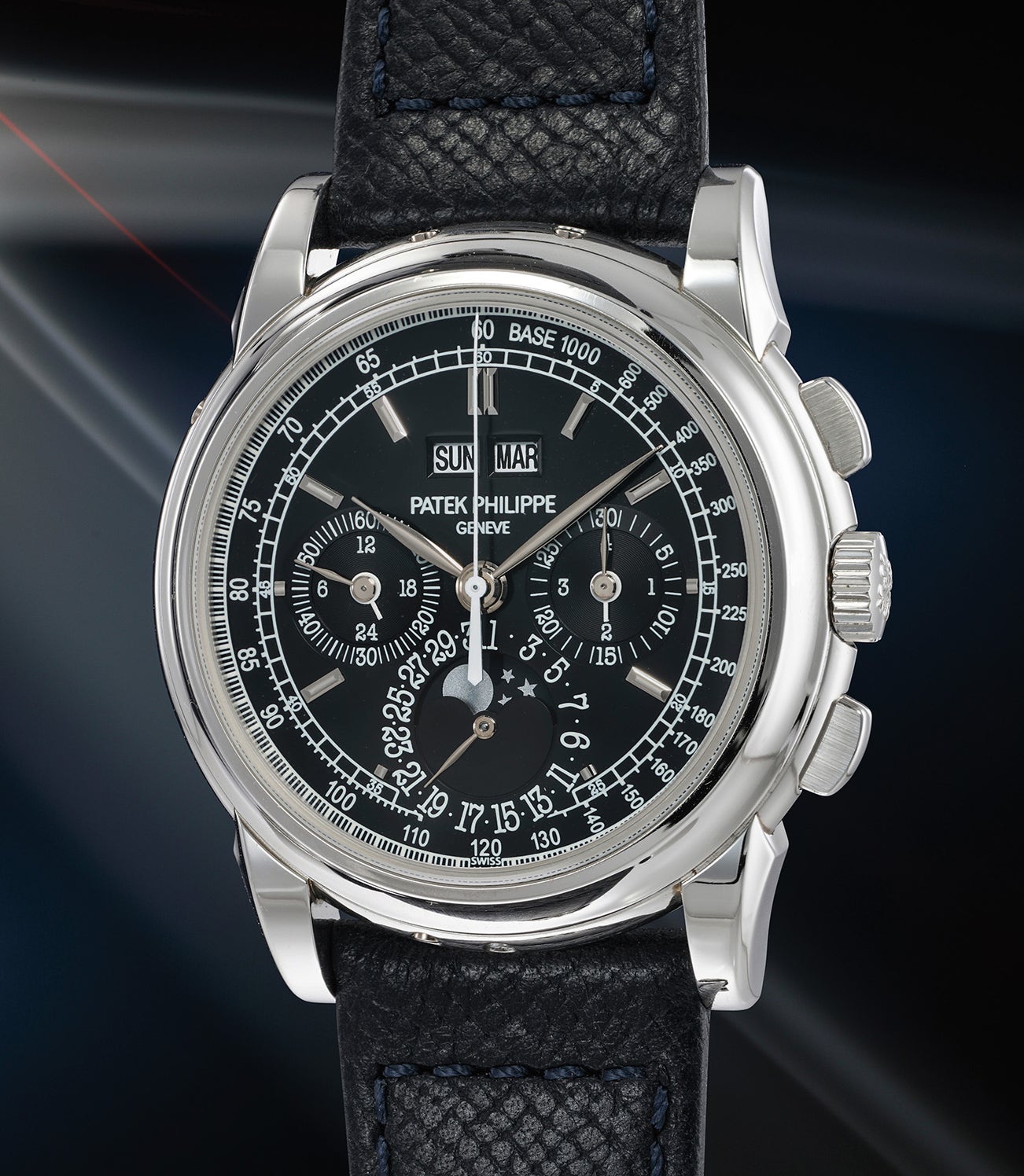 百達翡麗,十分罕有精美,鉑金萬年曆計時腕錶,備月相、24小時、閏年顯示。附原裝證書、調整筆、後底蓋、錶盒、配件