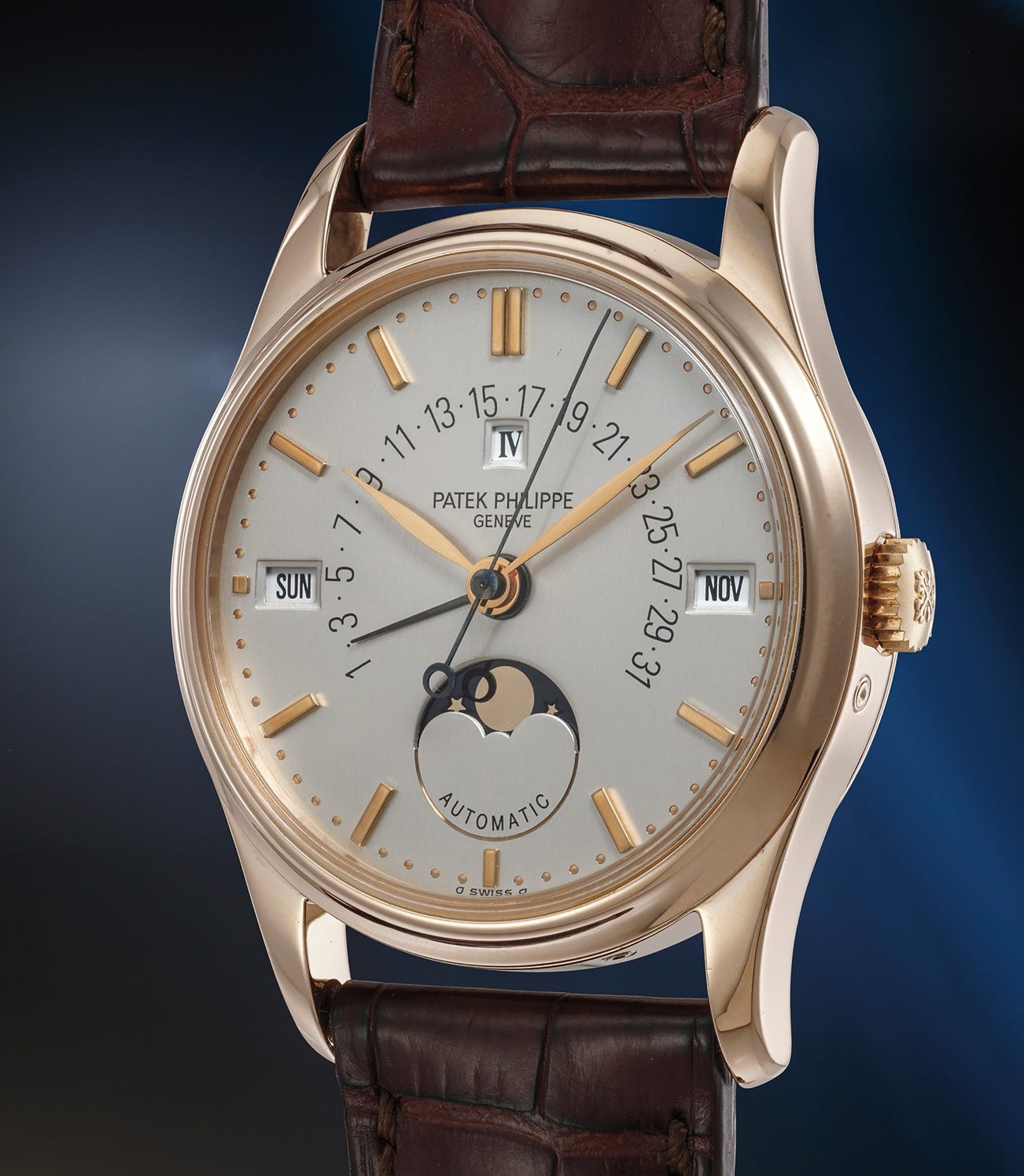 百達翡麗,優雅罕有,玫瑰金萬年曆腕錶,備中心秒針、逆返日曆、月相、閏年顯示。附備用後底蓋、錶盒