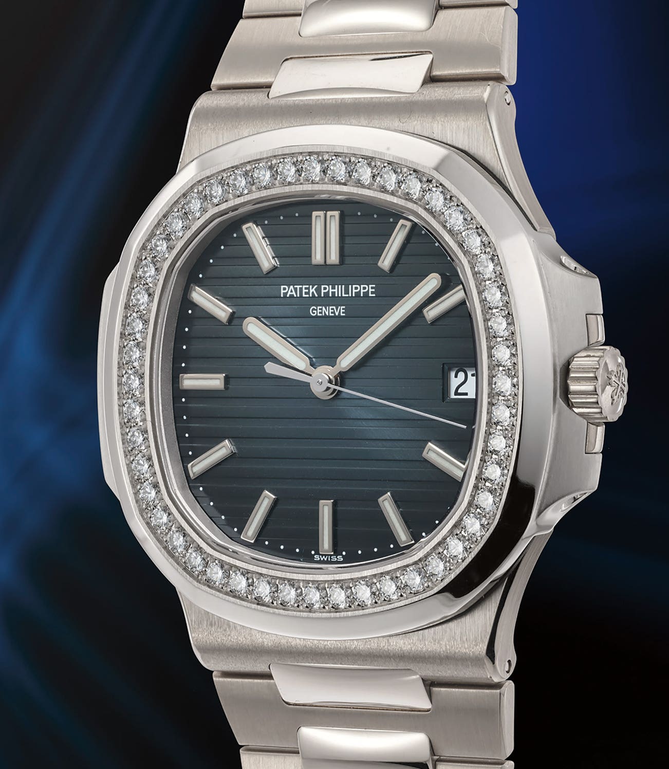 The present 5713/1G is an extraordinary example of the diamond-set Nautilus. Extremely rare and made in very few quantities, it is the ultimate inconspicuous watch. The case has a beautiful luster and glows incandescently in a way that can only be achieved with the use of white gold. As confirmed by the Certificate of Origin, the bezel is set with 48 brilliant-cut diamonds for a weight of approximately 1.50 carats. The watch is complete with original certificate, box, and preserved in excellent, barely worn condition. Fresh to the auction market and in lovely condition, this timepiece makes a grand addition to a collection of Patek Philippe wristwatches.