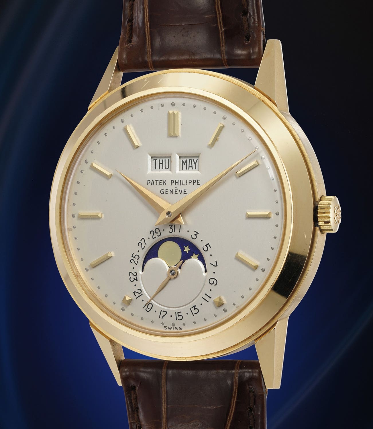 百達翡麗,可能尚未拋光打磨,黃金萬年曆腕錶,備月相顯示。