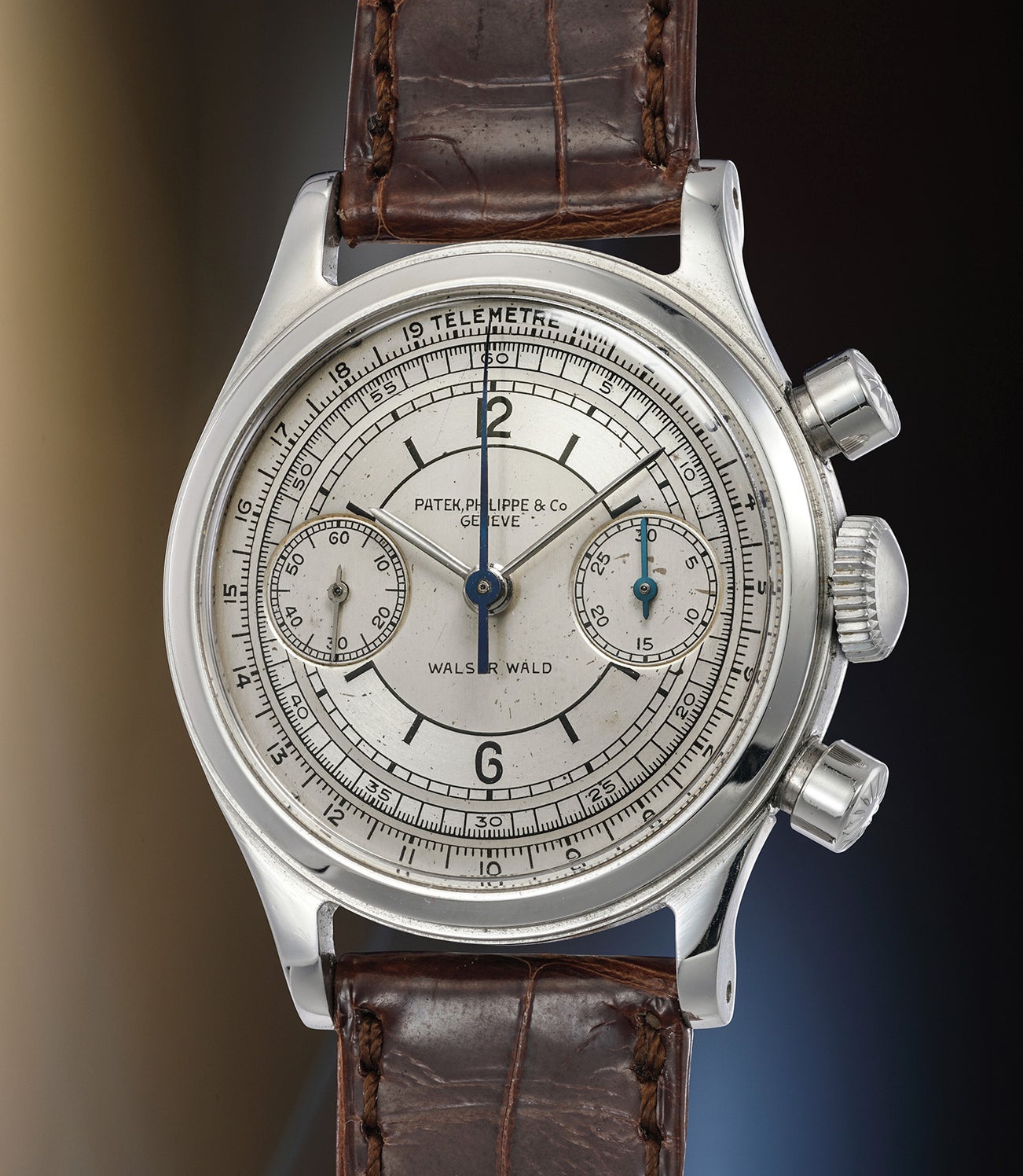 百達翡麗,極度精美罕有、十分重要,精鋼計時腕錶,備「Two-tone」扇面錶盤,由Walser Wald銷售。