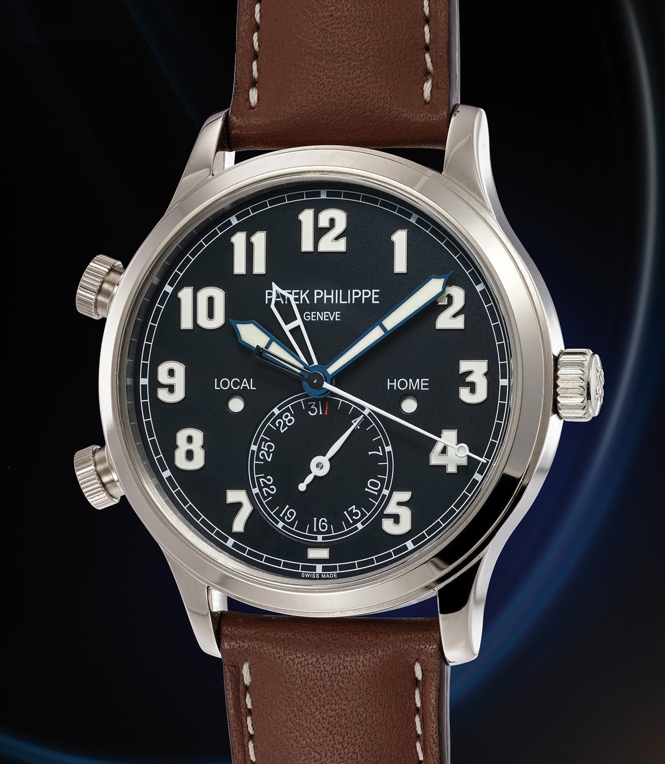 百達翡麗,精美,白金兩地時區飛行員腕錶,備日期、日夜顯示。附原裝證書、錶盒