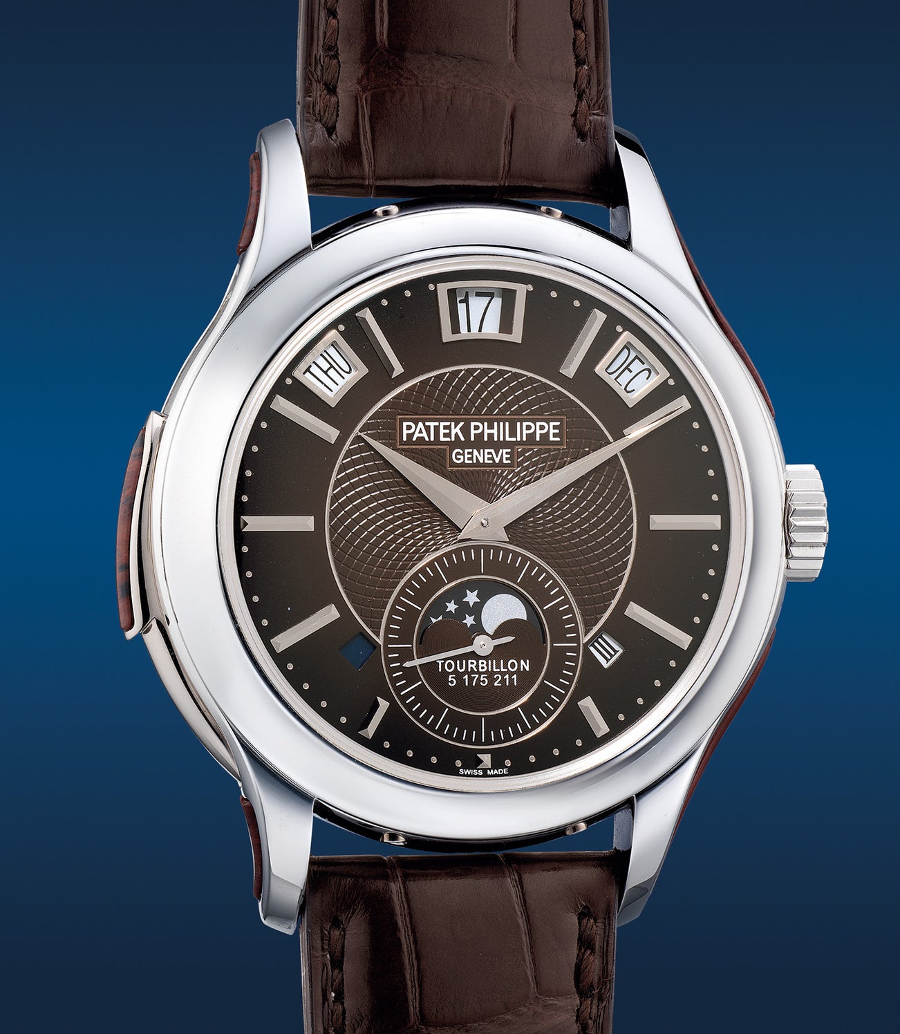 百達翡麗,型號5207/700P-001,極度精細罕有,鉑金三問瞬跳萬年曆陀飛輪腕錶,備璣鏤錶盤、閏年、月相、日夜顯示、桃花心木黑曜石裝飾錶殼,約2016年製。附錶盒、原裝證書、備用底蓋、調整筆