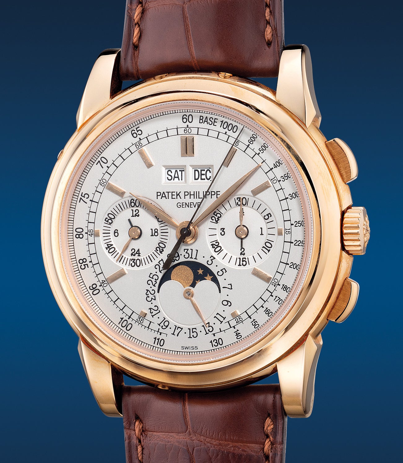 百達翡麗,型號5970R-001, 非常精細,玫瑰金計時萬年曆腕錶,備閏年、月相顯示,約2010年製。附原裝證書、錶盒、備用底蓋、調整筆