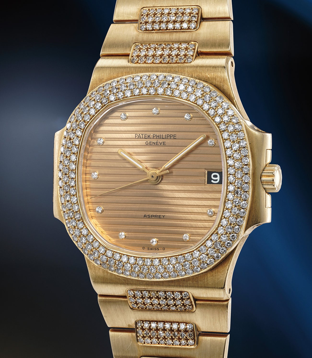 To finally conclude and reiterate the rarity of the present timepiece one has to simply look at the dial carefully. Placed at 6 o'clock is the elusive "Asprey" signature of which only two are known. The first one being a ref. 3800/1 cased in a regular yellow gold case, and the second one being this very example, ref.3800/5, with 3 rows of diamonds on the bezel and three rows on the centre links.