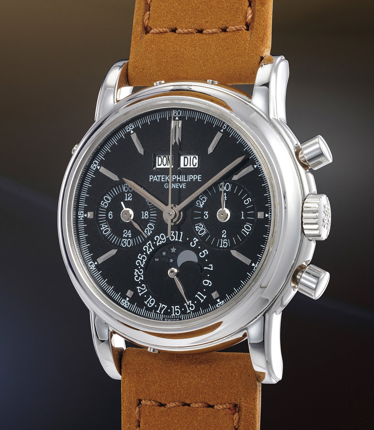 百達翡麗,非常精美罕有,鉑金萬年曆計時腕錶,備月相顯示、黑色錶盤、杵形時標。附後底蓋、調整筆、原裝證書