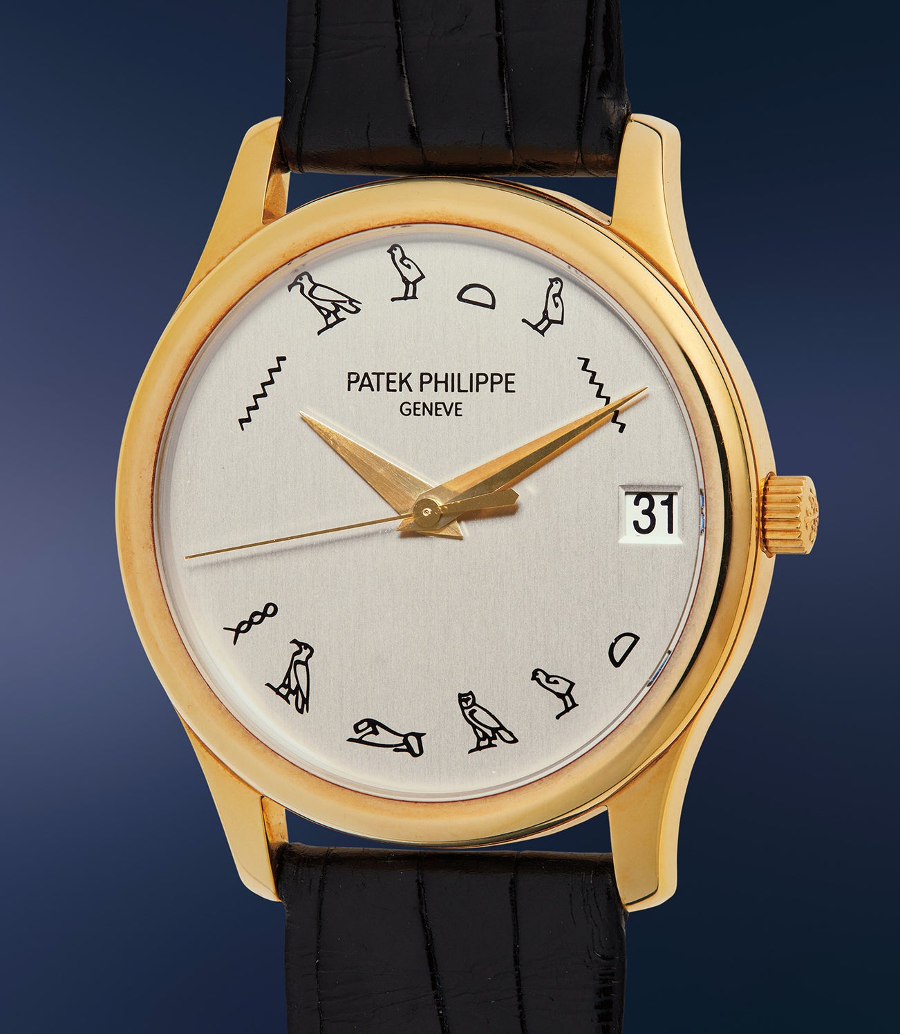 百達翡麗,獨一無二、極度罕有重要、十分精美,黃金腕錶,備埃及象形文字錶盤、日期顯示。附配件及錶盒