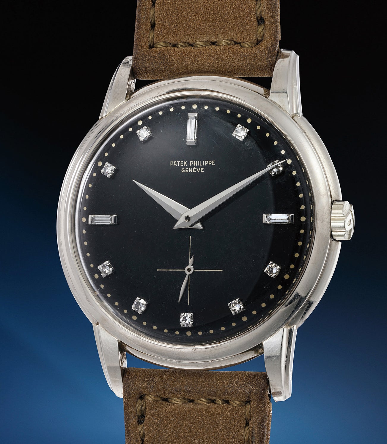 While the case design of ref. 2526 is stern and imposing, directly derived by the near-militaristic Bauhaus-inspired Calatrava designs of the 1930s and 1940s, reference 2551 is the time only version of one of the most flamboyant, striking, elegant and appreciated case designs of all times: that of reference 2499. The carved downturned lugs, the concave bezel, the contrasting convex band: Patek Philippe basically took the case of ref. 2499, removed the chronograph pushers, slimmed it down and made it waterproof with a screw-down back (similarly to ref. 2438/1) Predominantly cased in yellow or pink gold, the true connoisseurs of the brand consider it a classic in any metal. A white metal example, however, is above and beyond simple watch collecting, achieving true "grail status” already: in fact only a tiny fraction of the production (few dozen pieces out of the estimated couple of thousands examples produced) is in white gold. When a white gold example - such as the present one - is furthermore adorned with a black dial with diamond markers - arguably the most rare Patek Philippe dress watch dial design - we land in legendary territories as we are in front of a so far unique creation. To date, we are not aware of any other model with this dial and case metal combination.