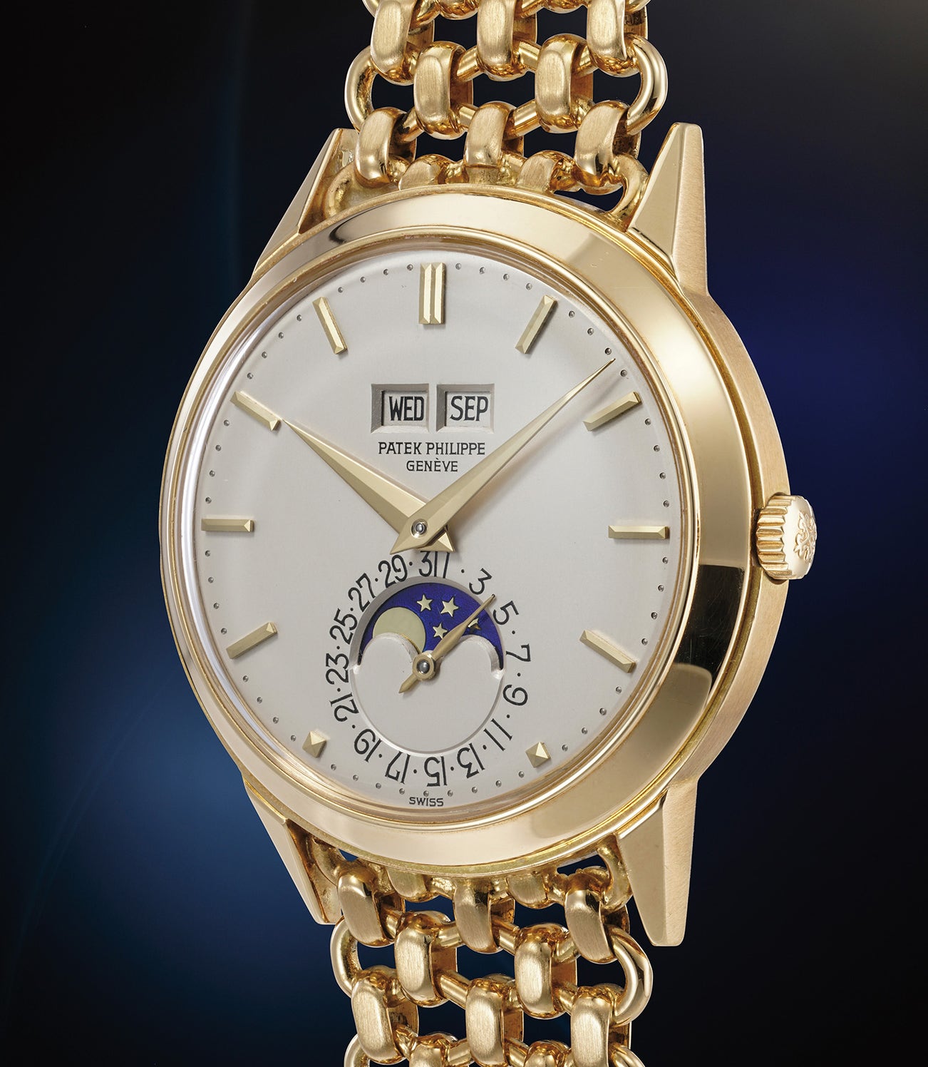 百達翡麗,罕有、可能獨一無二,黃金萬年曆鏈帶腕錶,備月相顯示、撥動日期環、錶耳。