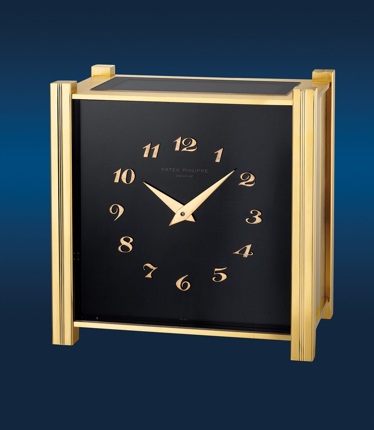 百達翡麗,型號928,精細,銅鍍金太陽能座鐘,備黑色漆面盤,1962年製。附後補證書