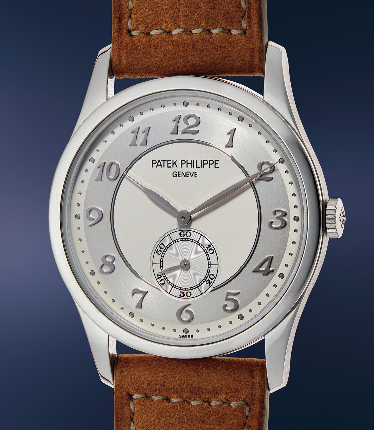 As with all modern platinum Patek Philippe timepieces, a discrete diamond between the lugs at 6 o'clock indicates the precious and rare metal case.