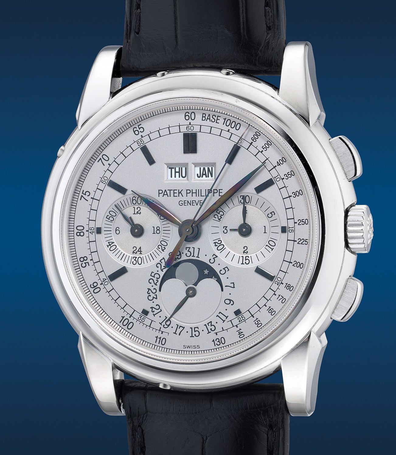 百達翡麗,型號5970G-001, 非常精細, 白金萬年曆計時腕錶,備閏年、月相顯示,約2008年製。附原裝證書、錶盒、備用底蓋、調整筆