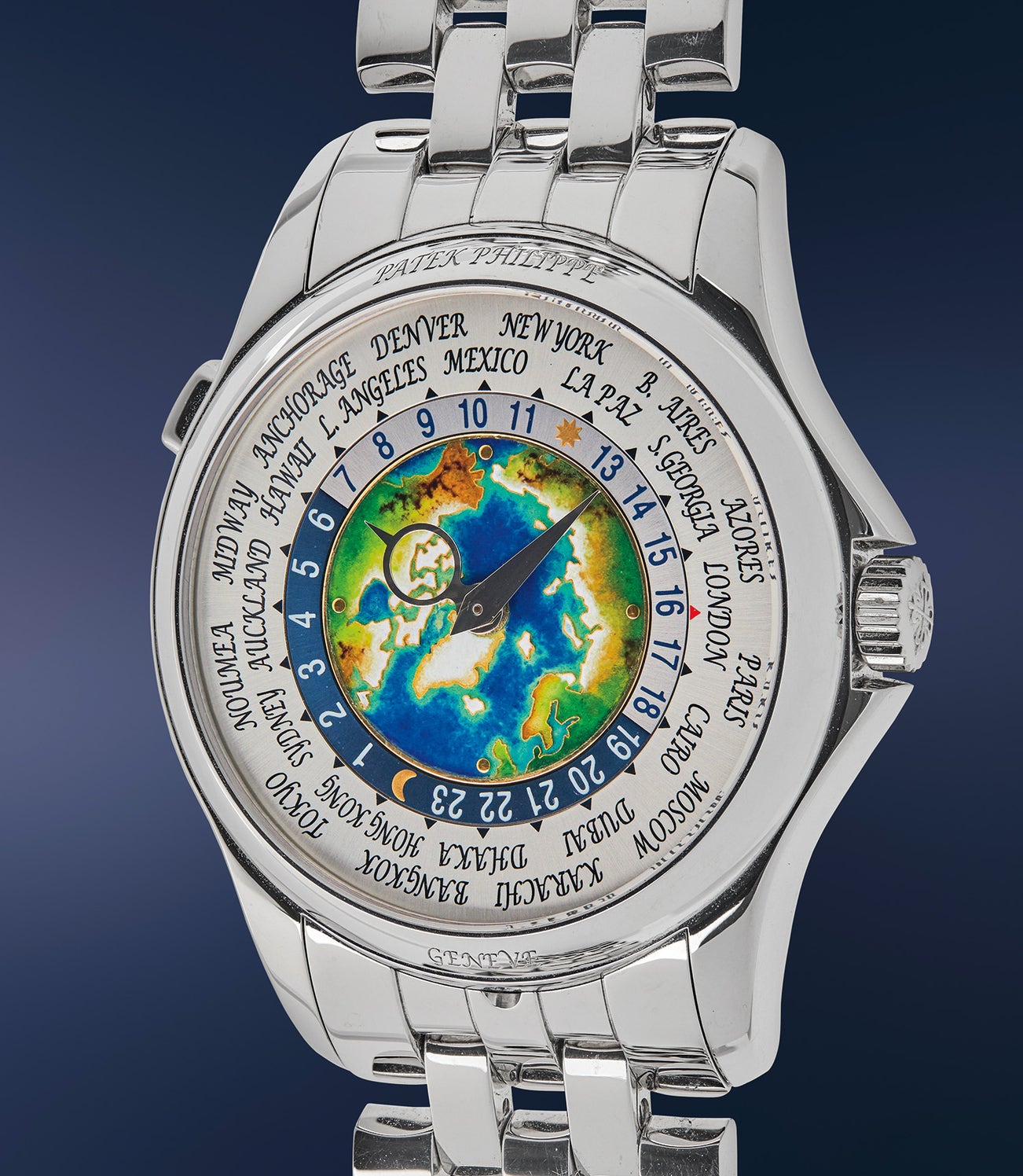 Patek Philippe has since embraced the artistic opportunities worthy of such a poetic yet practical complication, and in many instances, combined it with one of their most exclusive métiers d'arts creations - cloisonné enamel. In this example, fully complete and consigned by the original owner, the vibrant cloisonné enamel center disc depicts the North Pole in a wonderful array of blues, greens, browns, and yellows – all outlined in fine gold. A well-balanced 40mm in diameter, and fitted with a luxurious and heavy platinum link bracelet, this modern horological masterpiece marries the old and the new perfectly, and is sure to be the perfect companion for the well-traveled connoisseur.