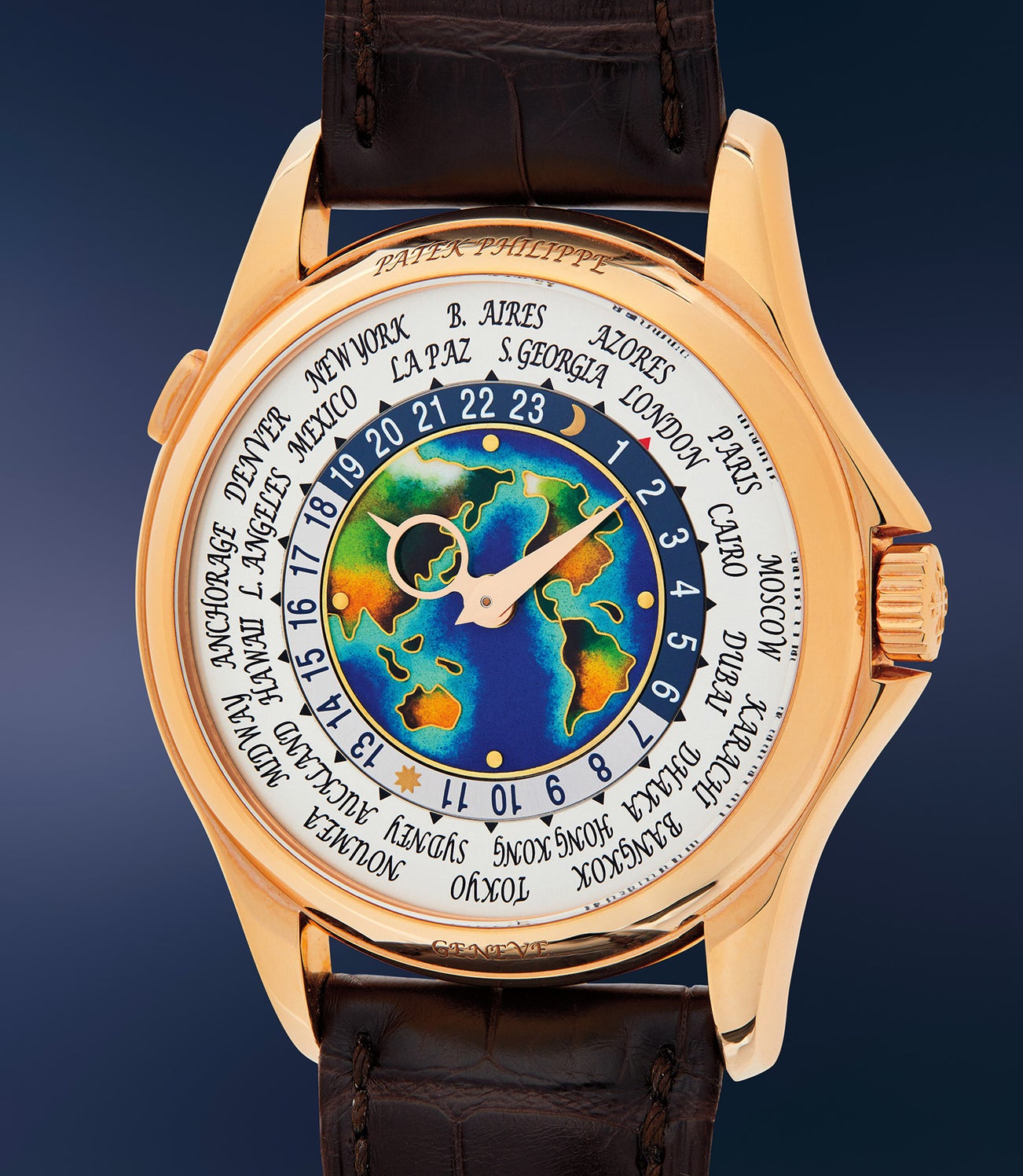 百達翡麗,非常罕有精細,玫瑰金世界時區腕錶,備掐絲琺瑯錶盤。附原裝證書及錶盒