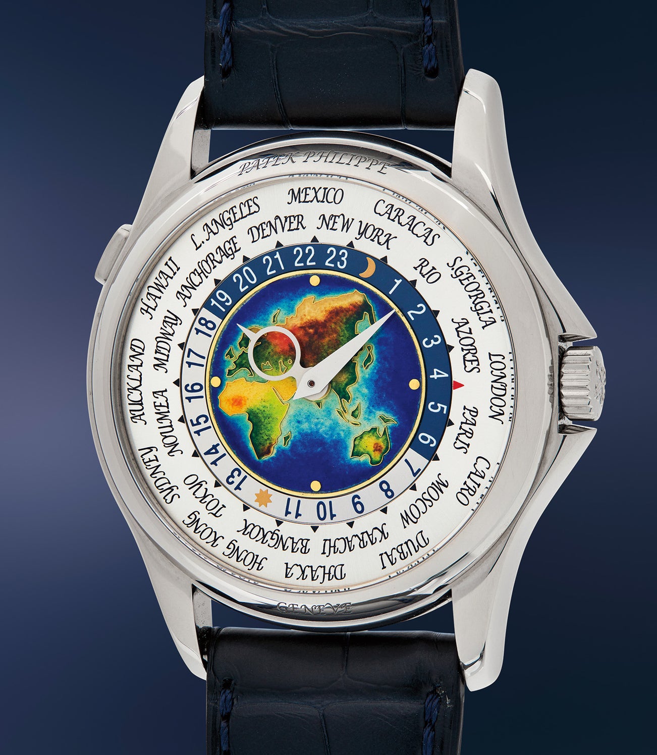 百達翡麗,精細,白金世界時區腕錶,備掐絲琺瑯錶盤。附原裝證書及錶盒