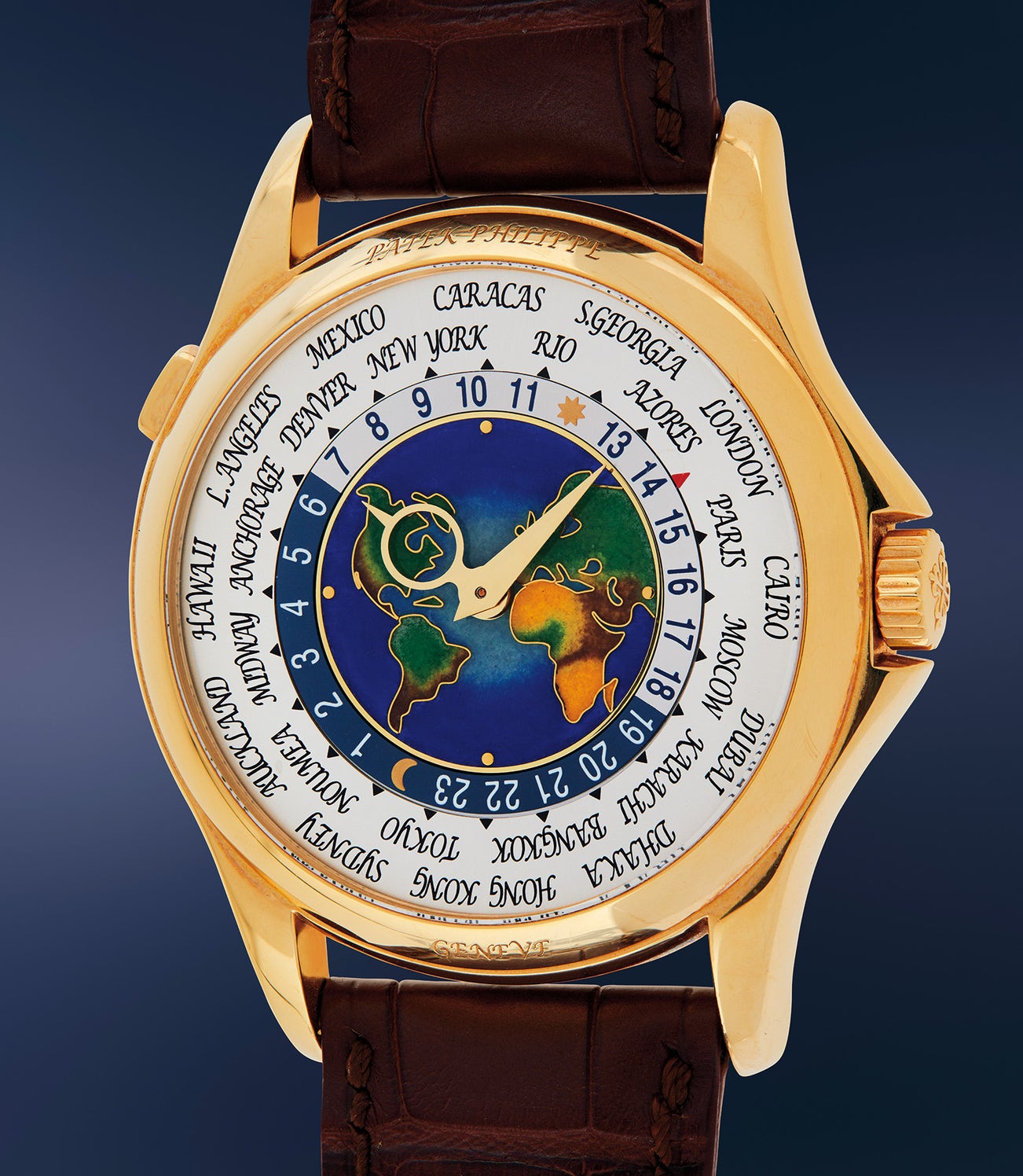 百達翡麗,非常罕有精細,黃金世界時區腕錶,備掐絲琺瑯錶盤。附原裝證書及錶盒