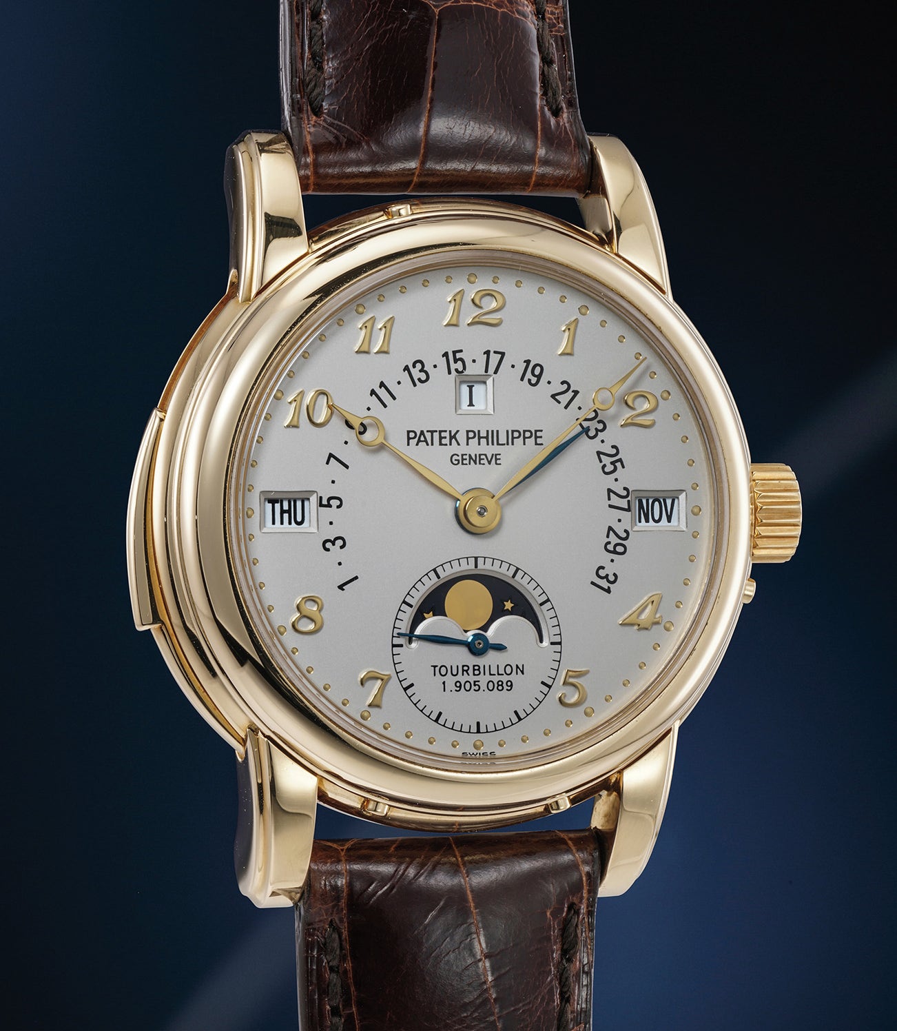 百達翡麗,極度罕有重要,黃金三問萬年曆腕錶,備陀飛輪、逆返日曆、月相顯示、寶璣字時標。附後底蓋、調整筆、原裝證書及錶盒