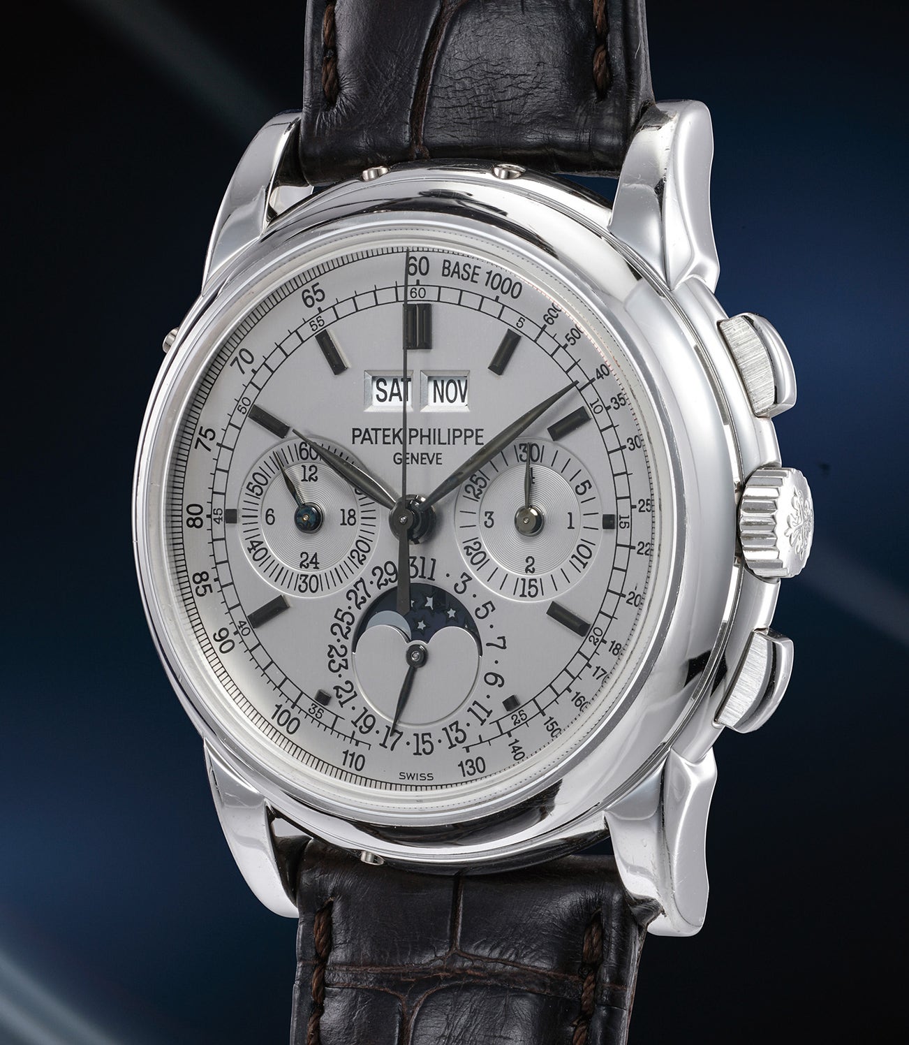 百達翡麗,優雅精細,白金萬年曆計時腕錶,備月相、24小時、閏年顯示。附原裝證書、調整筆、後底蓋、錶盒、配件