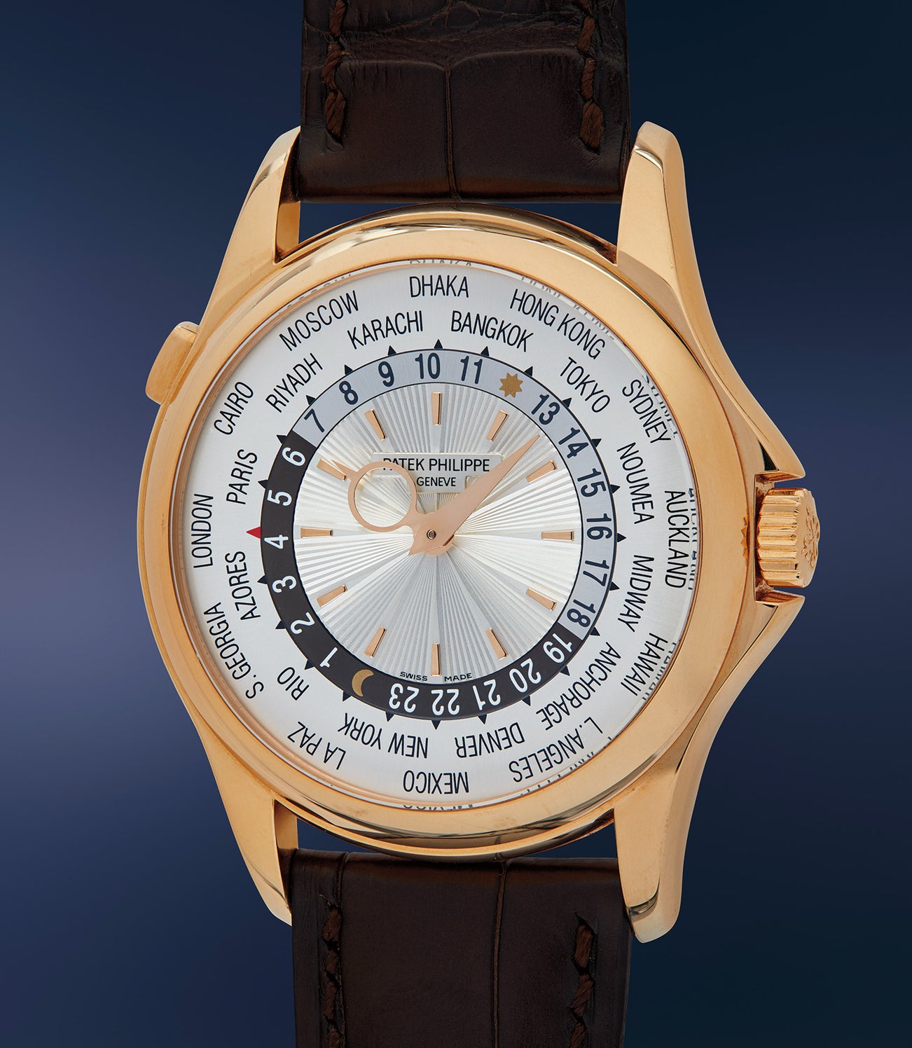 Produced in all four precious metals including yellow gold, pink gold, white gold, and platinum, the -018 variant is quite rare, with only two having ever been offered publicly. While aesthetically indistinguishable from the -001 variant, the present 5130R-018 features La Paz and Moscow on the outer ring, and Riyadh on the inner ring, while the -001 features Caracas and Dubai on the outer ring, and Moscow on the inner ring. All variations of the reference were discontinued entirely in 2016 making way for the new ref. 5230.