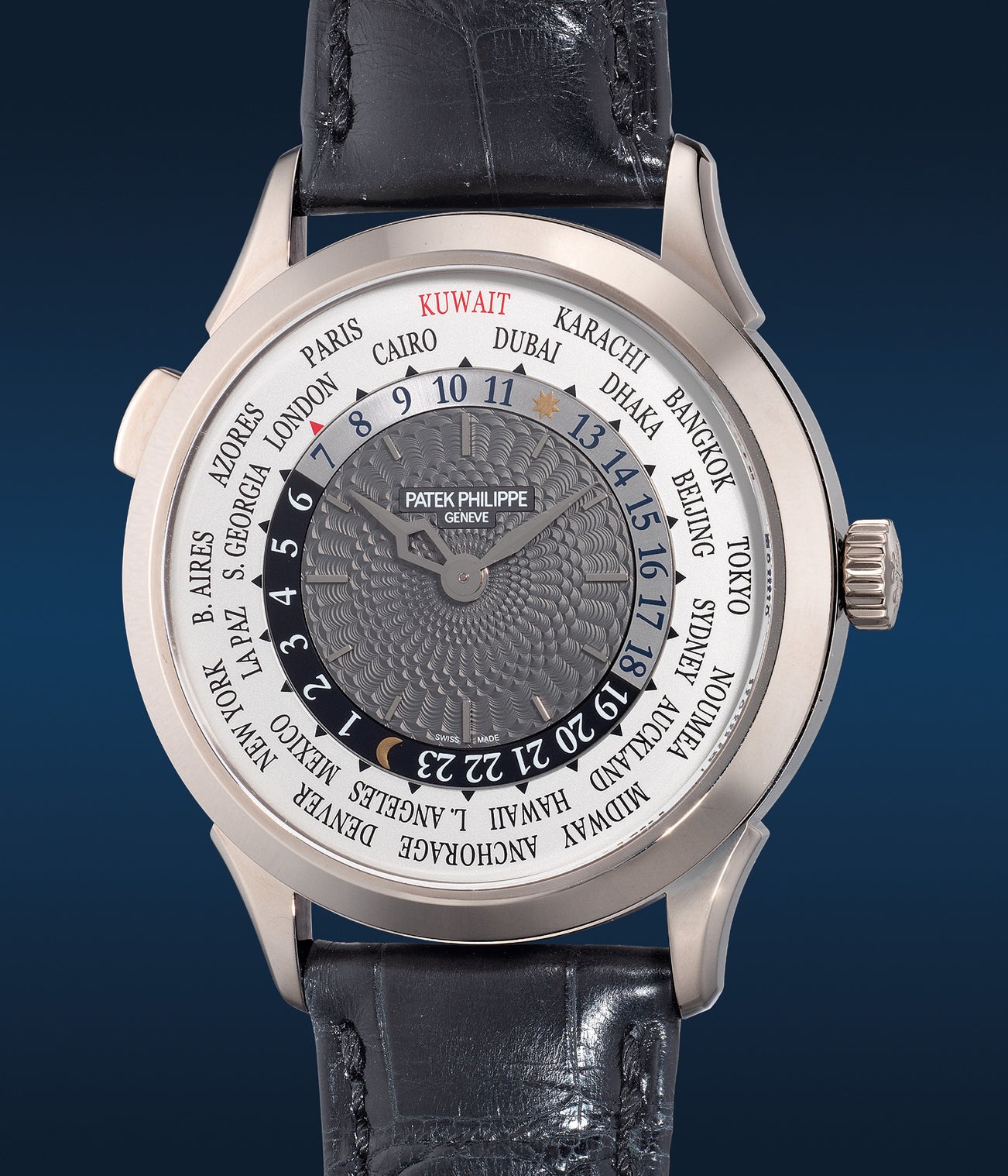 Appearing in auction for the first time, the present timepiece is not your average Patek Philippe ref. 5230. A rare collectible, this Kuwait Edition World Time is based on the original reference with two obvious differences that sets it apart from the rest. Starting with the dial, the 24 world cities chapter ring has been updated with “Moscow” removed to make way for “Kuwait”, highlighted in a bright regal red tone. Notably, the two regions share the same Arabian timezone of GMT+3, which explains the astute design decision. In addition, the sapphire caseback is graced with a highly desirable Emblem of Kuwait, prominently outlined in black.