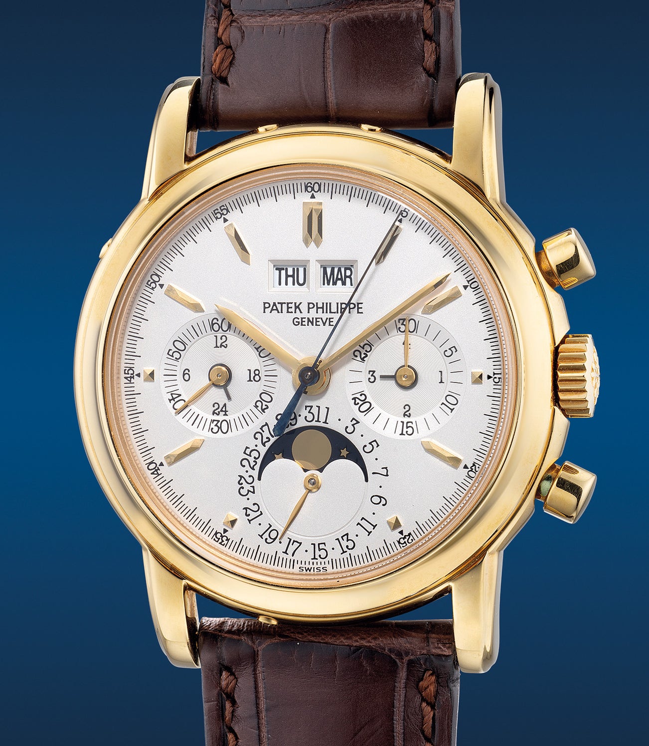 百達翡麗,型號3970EJ-014,黃金萬計時萬年曆腕錶,備月相、閏年、24小時顯示,約2001年製。附原裝證書、錶盒、底蓋、調整筆