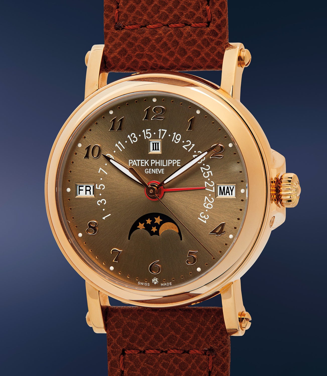 百達翡麗,可能獨一無二、重要,玫瑰金萬年曆腕錶,備棕色夜光花押字錶盤、寶璣字時標、月相、閏年顯示、將官式後蓋。附原裝證書、配件、調整筆及錶盒