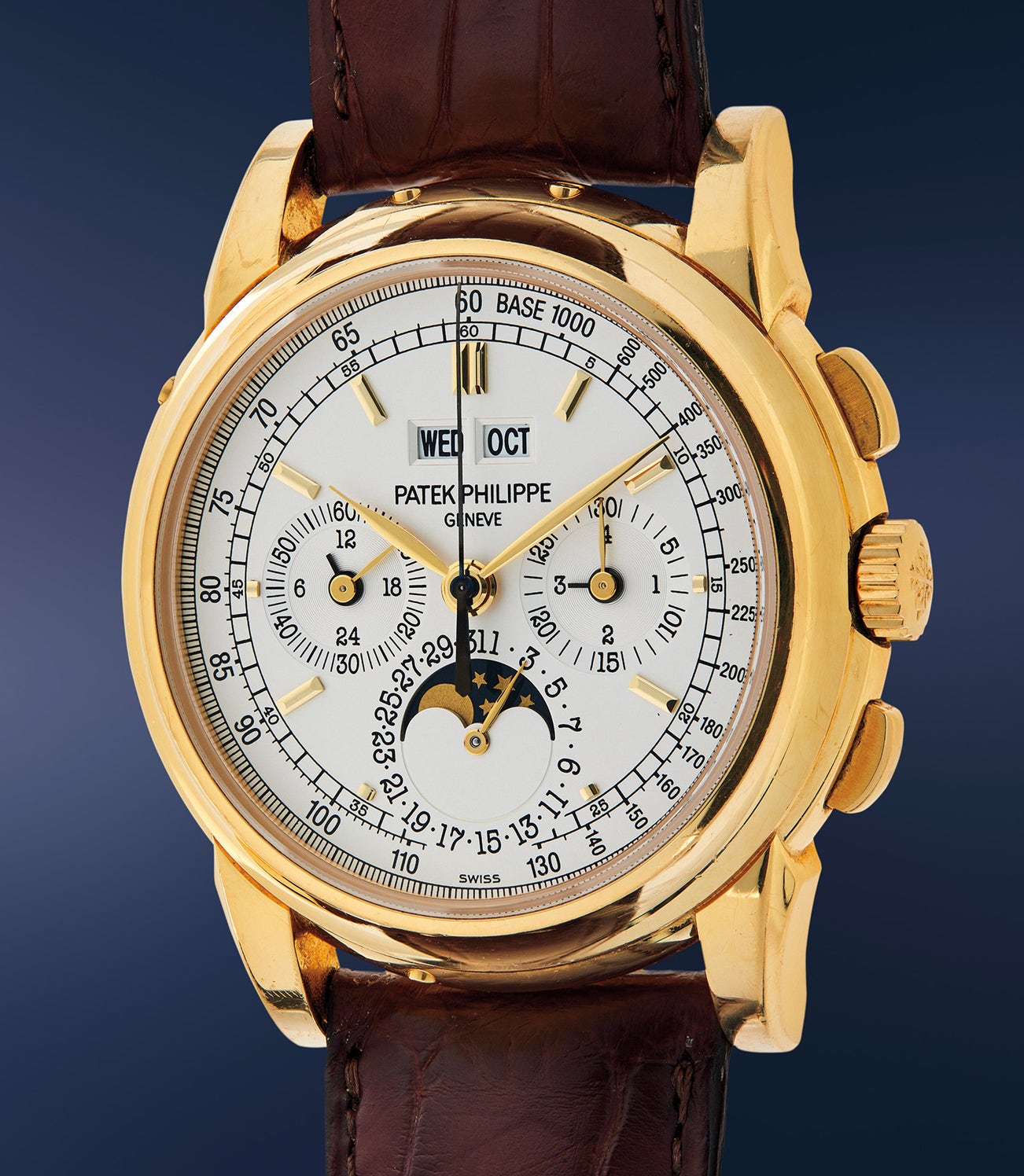 The present example from 2009 is offered as a complete set, accompanied by its Certificate of Origin, presentation box, and additional solid caseback. Produced in yellow, pink, and white gold as well as platinum, yellow gold examples are considered the rarest. It represents a rare opportunity to obtain one of Patek Philippe’s most desirable classical perpetual calendar chronograph models in yellow gold, hardly ever offered on the market.