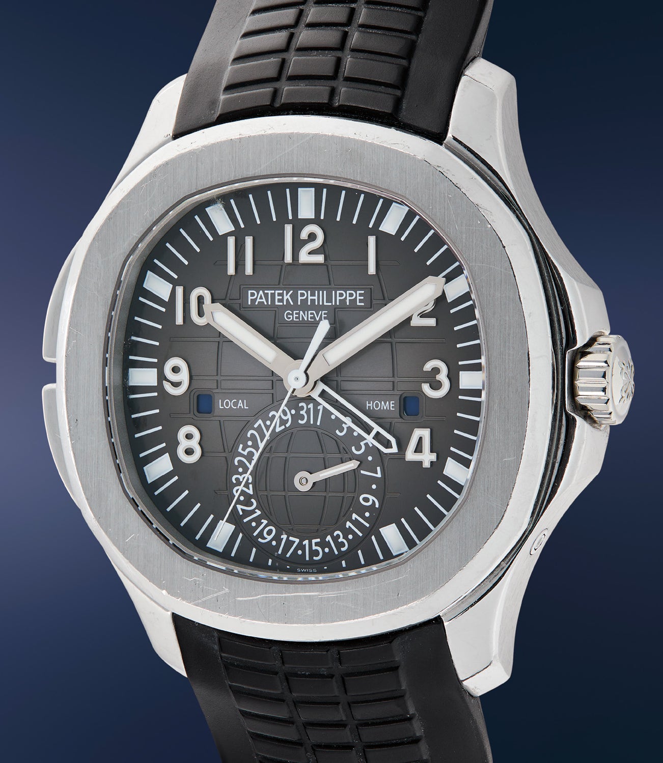 Similar to the evolution of other Patek Philippe collections, the Aquanaut reference 5164A Travel Time was released in 2011 as the first complicated Aquanaut. Featuring a practical dual time function indicated by an additional white skeleton hand, the dial also depicts both home and local day and night indication through two small apertures. Fitted with two pushers on the left side of the case band without breaking its symmetry, the pushers allow for easy adjustment to the local time. Retaining its iconic case design with a modern 41.5mm diameter, the comfort is further enhanced via its rubber strap. The reference was introduced in stainless steel first, with a pink gold iteration launched at SIHH in 2016