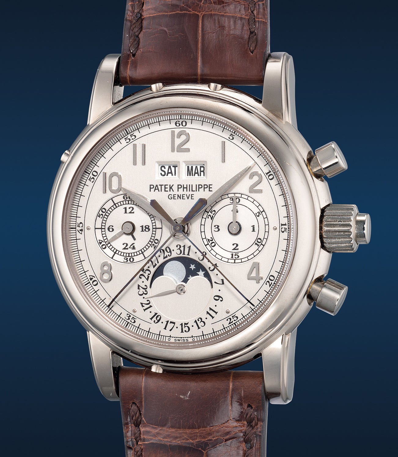 百達翡麗,型號5004G-013,極度複雜罕有,白金追針計時萬年曆腕錶,備月相、閏年、日夜顯示,2010年製。附後補證書、錶盒、備用底蓋、調整筆