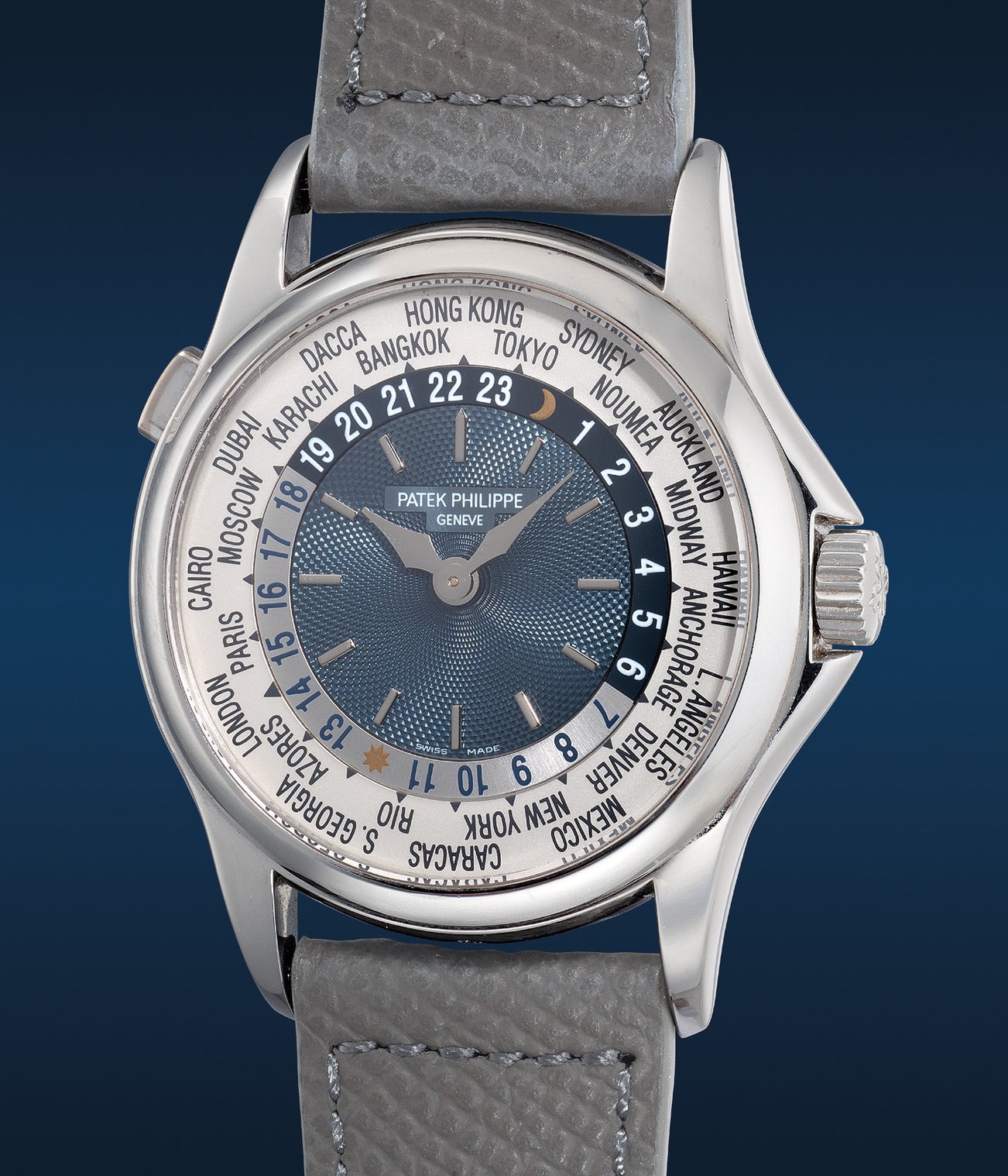 Retailed by the esteemed Tiffany & Co, the present platinum World Time ref. 5110P-001 is a rare specimen, bearing a hand-engraved designation of the retailer along the caseband at 9 o’clock. This quiet giant is measured at 37mm, fitted with smooth straight lugs and is a quintessential Calatrava through and through. New at the time to Patek Phillippe, the hands are defined by their contours that flatter the baton-shaped applied hour markers. Taking cues from the manufacturer’s heritage as masters of pocket watches, the centre of the dial also features hand-engraved guilloche patterns that bring depth to the flat surface. Closed with a sapphire caseback, the wearer is also invited to admire its uber-thin cal. 240HU is an automatic movement that is technically sound and as beautifully finished as its dial, with Geneva stripes, perlage and anglage.