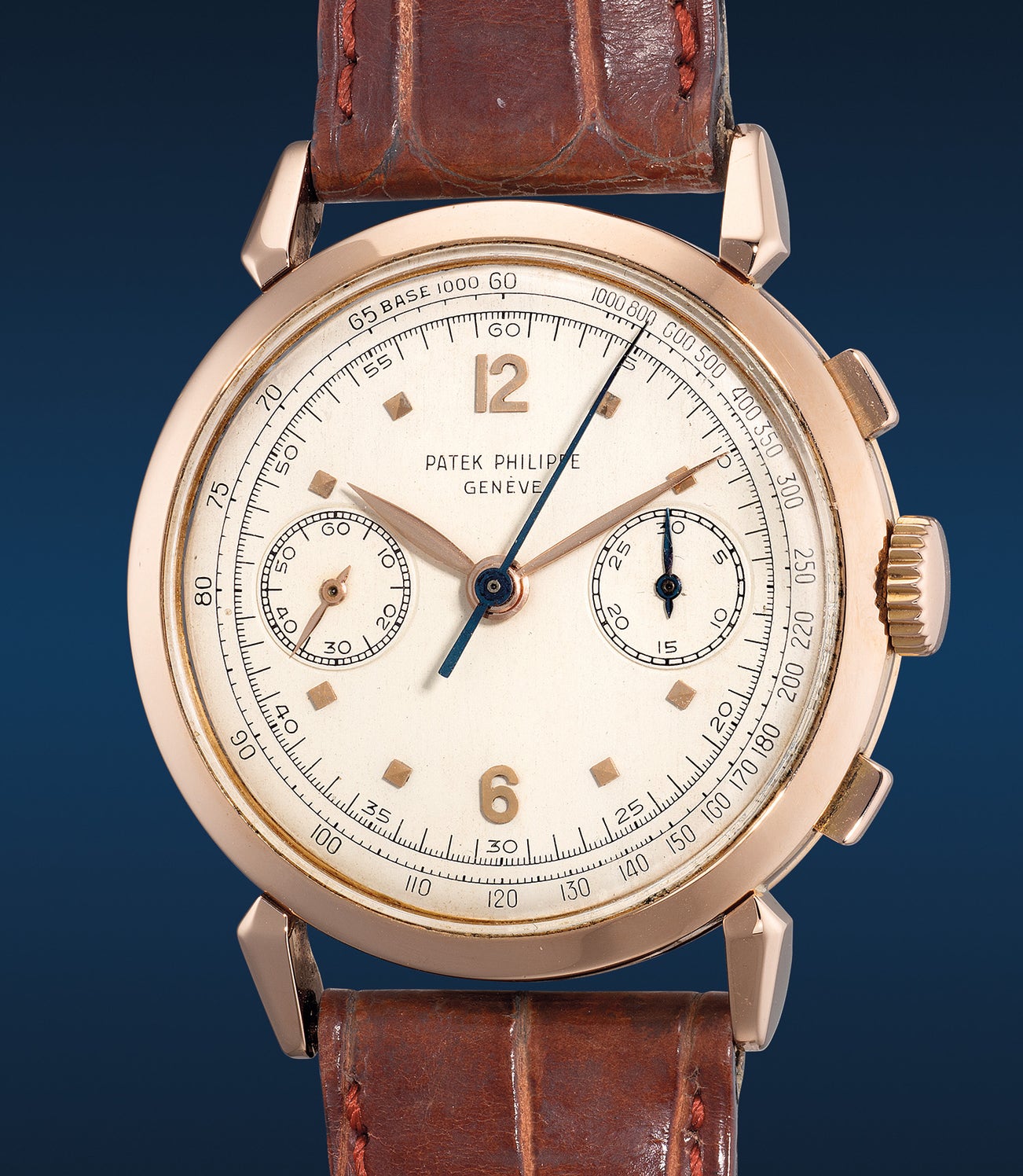 百達翡麗,型號1579,精細及 十分罕有,玫瑰金計時腕錶,備「Spider lugs」錶耳,約1955年製。附原裝證書、錶盒