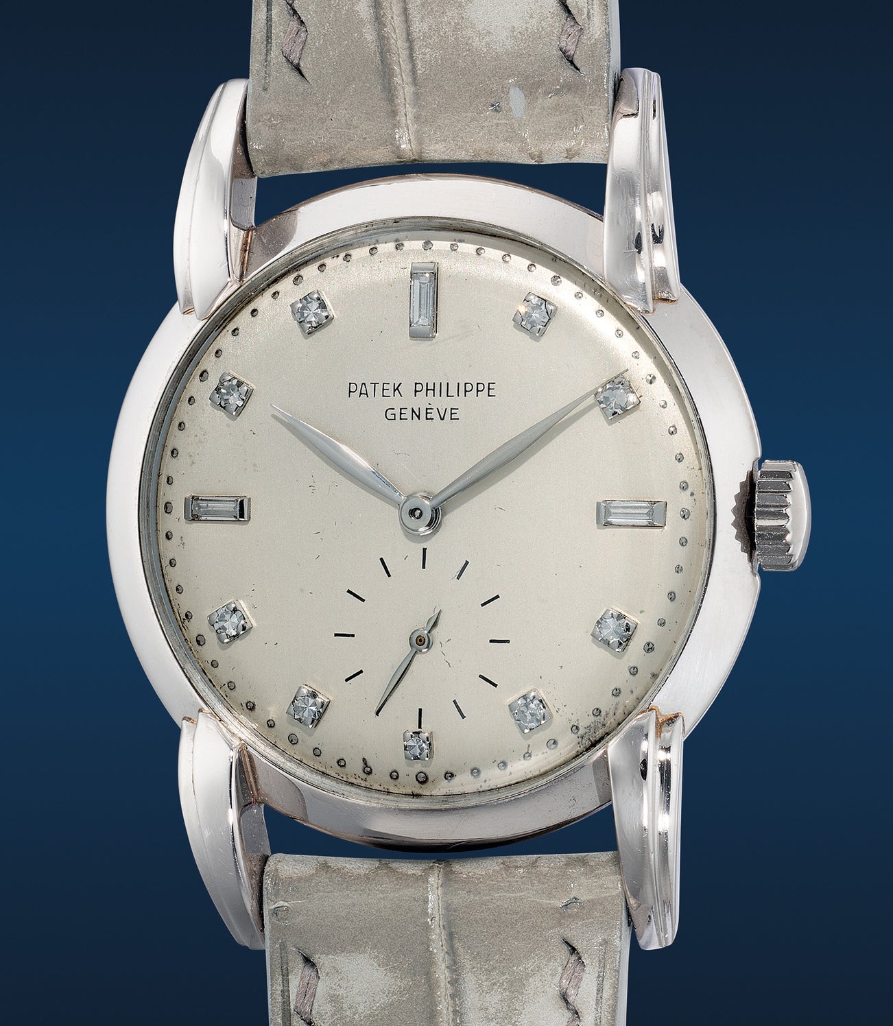 百達翡麗,型號2429,極度精細罕有,鉑金小三針腕錶,備鑽石時標錶盤,1951年製。附後補證書