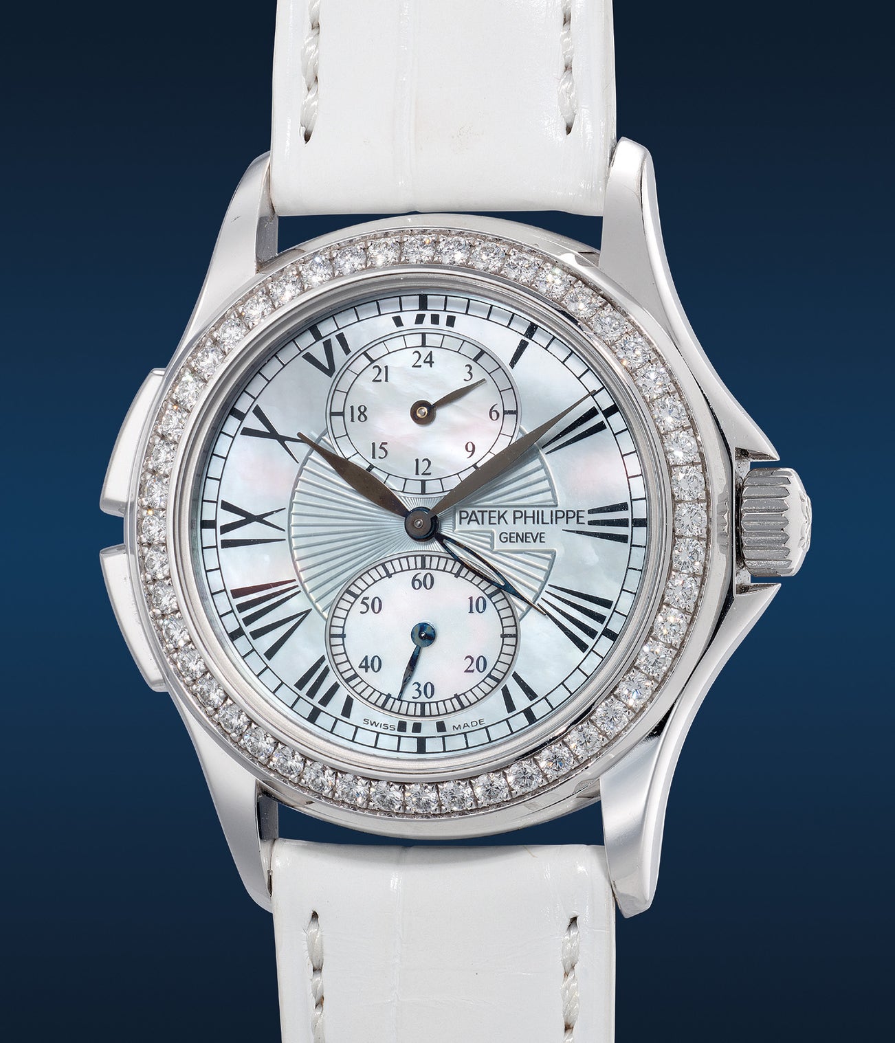 百達翡麗,型號4934G-001,精細,白金鑲鑽兩地時區腕錶,備珠母 貝璣鏤錶盤、24小時顯示,約2010年製。附原裝證書、錶盒、配件