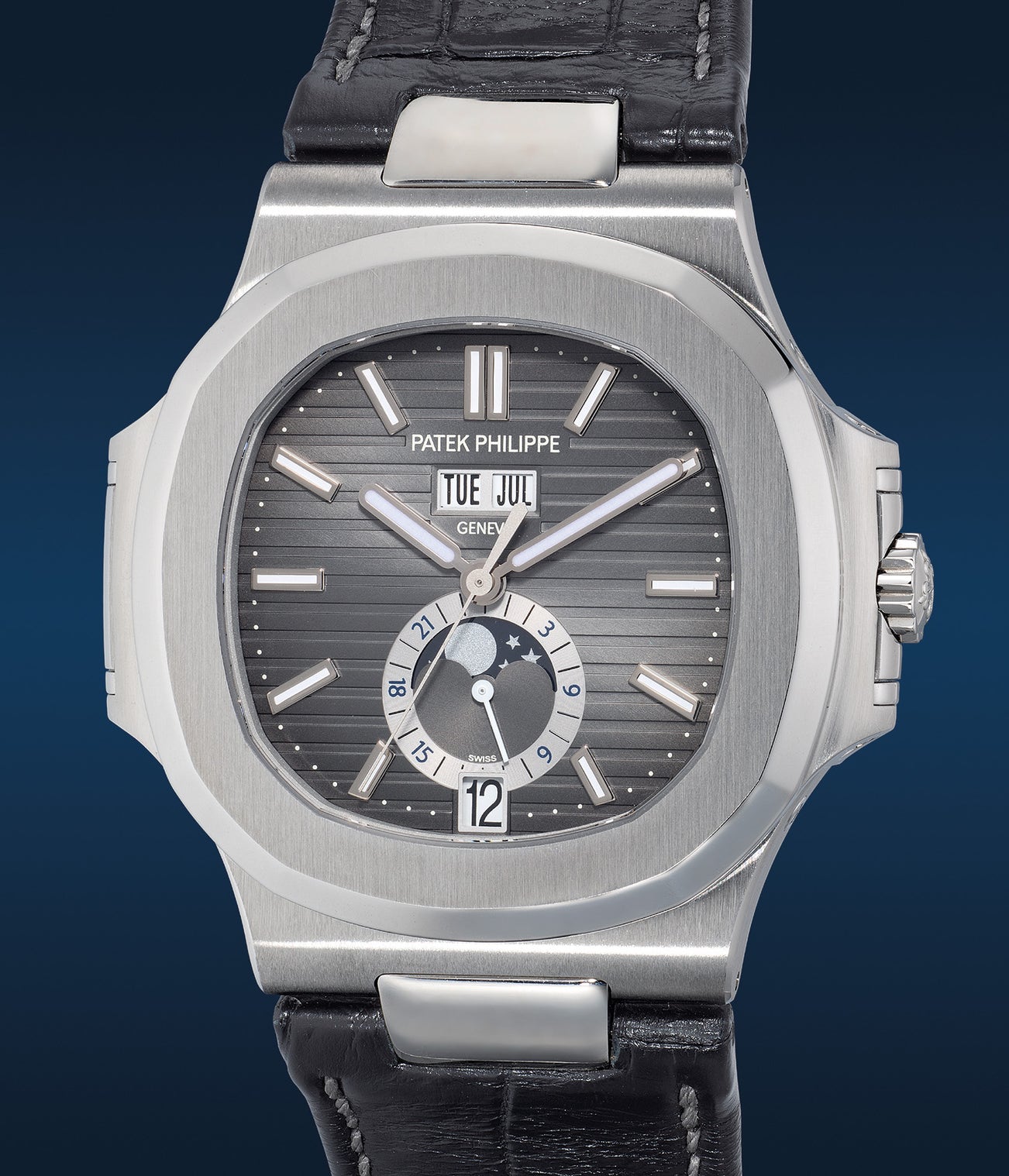 百達翡麗,「Nautilus」型號5726A-001,精細,精鋼自動年曆腕錶,備中心秒針、月相、24小時顯示,約2011年製。附原裝證書、錶盒、配件
