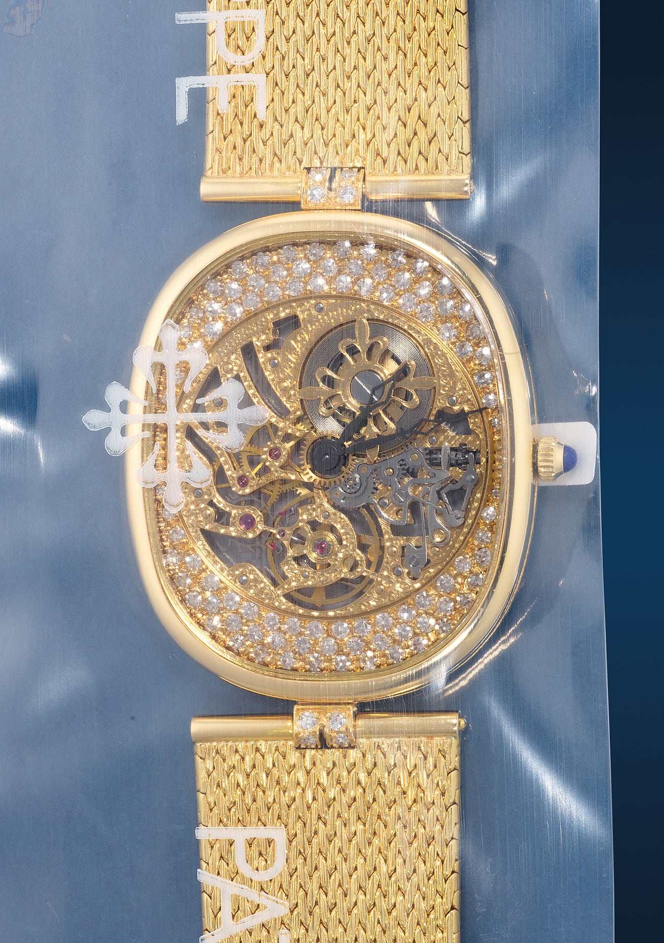 百達翡麗,精細及罕有,「Ellipse Squelette」型號3881J-001,黃金鑲鑽枕形鏤空鏈帶腕錶,1982年製。附後補證書、保養單據