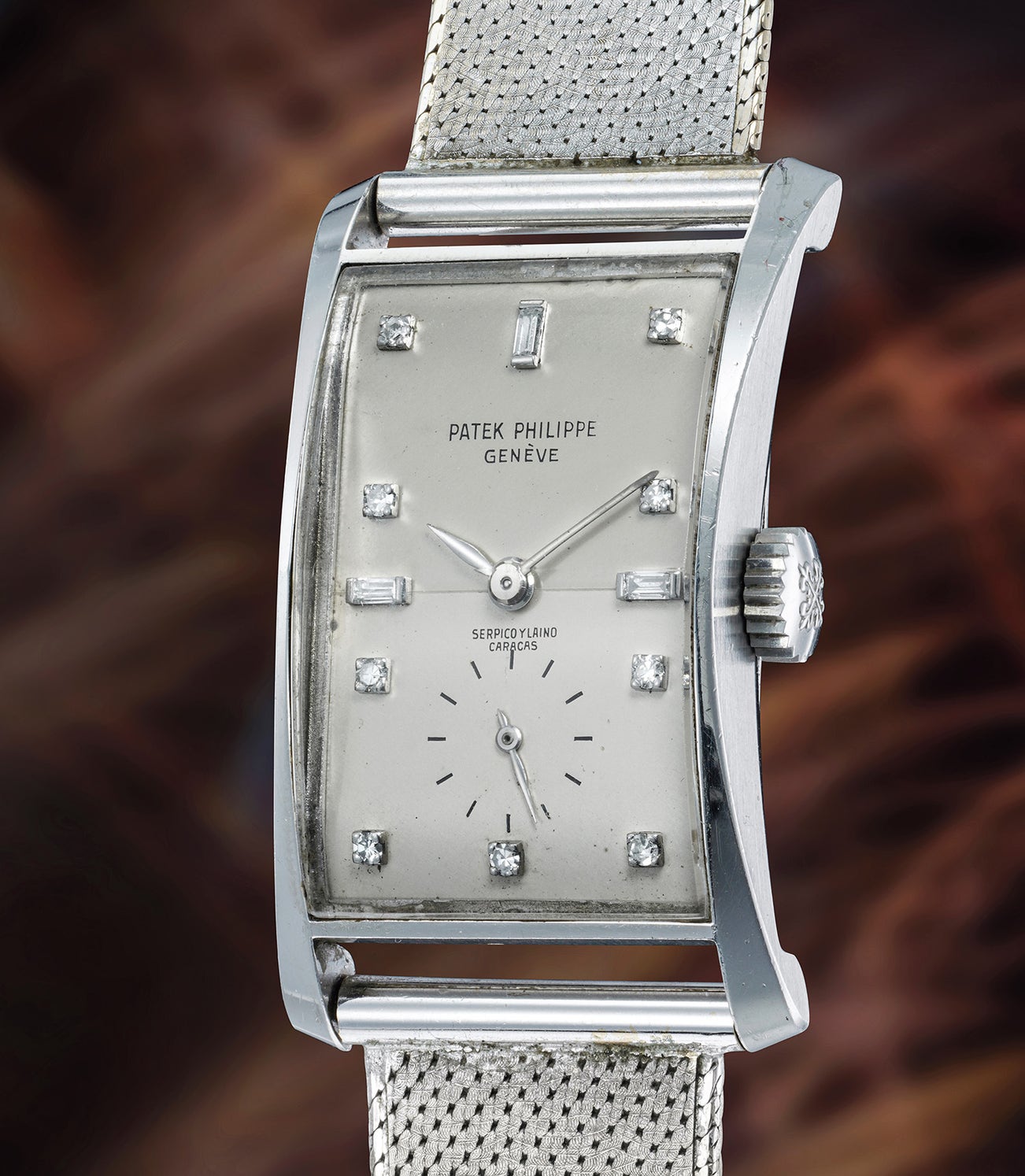 百達翡麗,極度罕有、優雅,鉑金鏈帶腕錶,備輔助秒、鑲鑽時標、白金錶帶,由Serpico y Laino銷售。