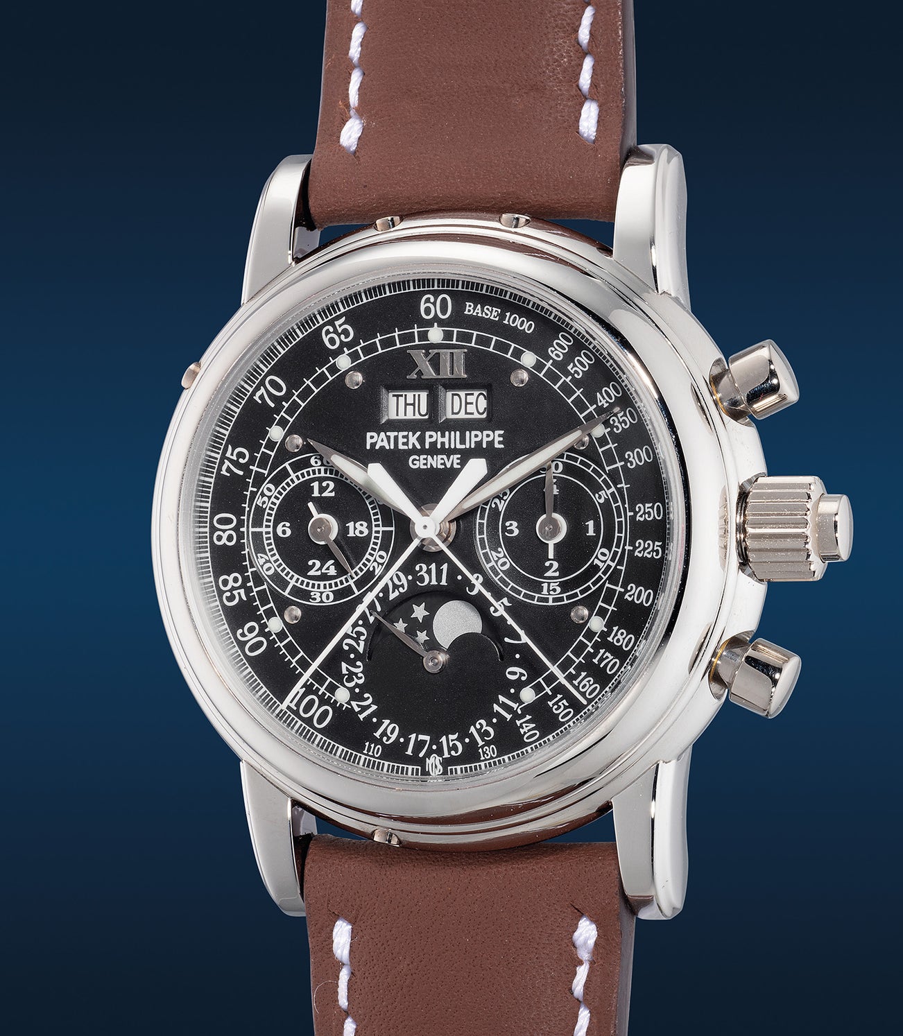 百達翡麗,型號5004P-041,非常重要及可能獨一無二,特別版鉑金黑面腕錶,配萬年曆、 追針計時功能、閏年、月相顯示和極罕有夜光功能錶盤, 2008年製。附原裝證書、調整筆、配件、後補證書