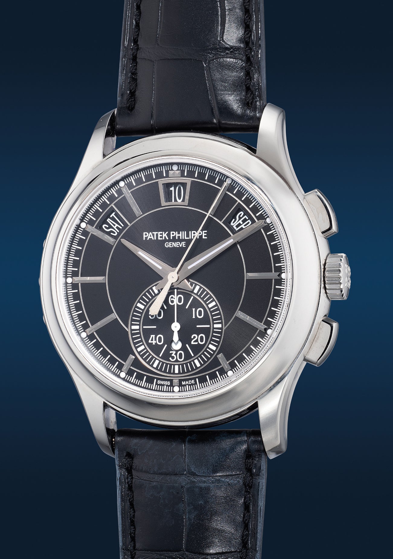 百達翡麗,型號5905P-010,罕有,鉑金自動年曆腕錶,備飛返計時功能、黑色日輝紋錶盤,約2018年製。附原裝證書、錶盒