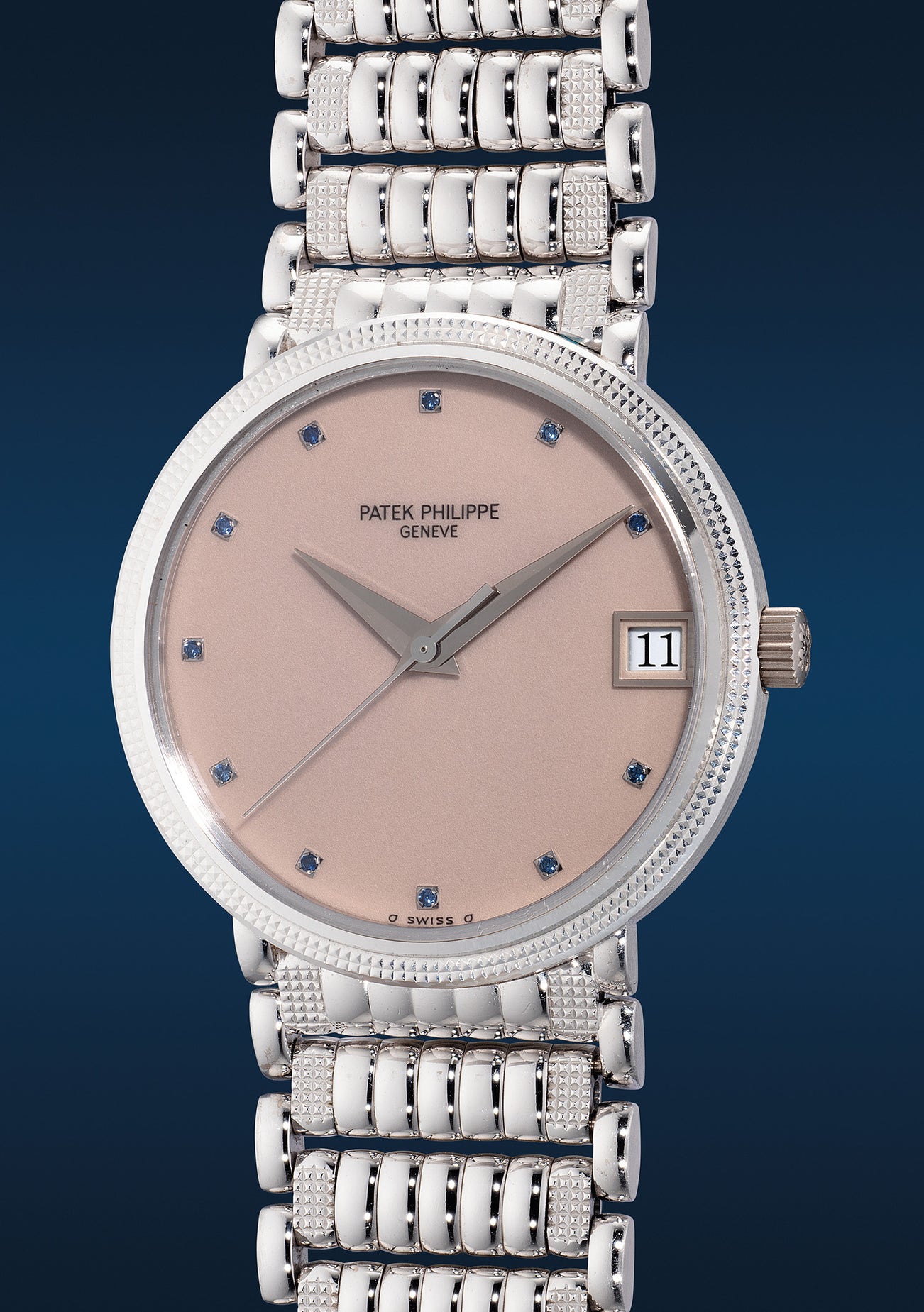 An icon on its own, the first Patek Philippe Calatrava to be adorned with a Clous de Paris bezel was the ref. 96D (D for décor) from 1934. Under close inspection, the double rings of pyramid shaped nails encircling the dial catches light beautifully to another dimension. Unveiled decades later, the ref. 3802 was born in 1983, bearing similar traditional features with a modern twist. Taking cues from its predecessor, the present model is a ref. 3802/208. Apart from the commonly seen variant featuring a white dial with refined Roman indexes, the present example stands out by miles. Ivory with a hint of lavender in colour, the dial of this ref. 3802 is adorned with 11 brilliant blue sapphire indexes that brings life to this white gold Calatrava. A staple classic to own, the full length intricate white gold bracelet with matching Clous de Paris details is a delight to wear. Well-preserved not only with good looks but also practicality thanks to its calibre 315 SC for its quick-set date, this classic Patek Philippe might just be the next watch you are looking for.