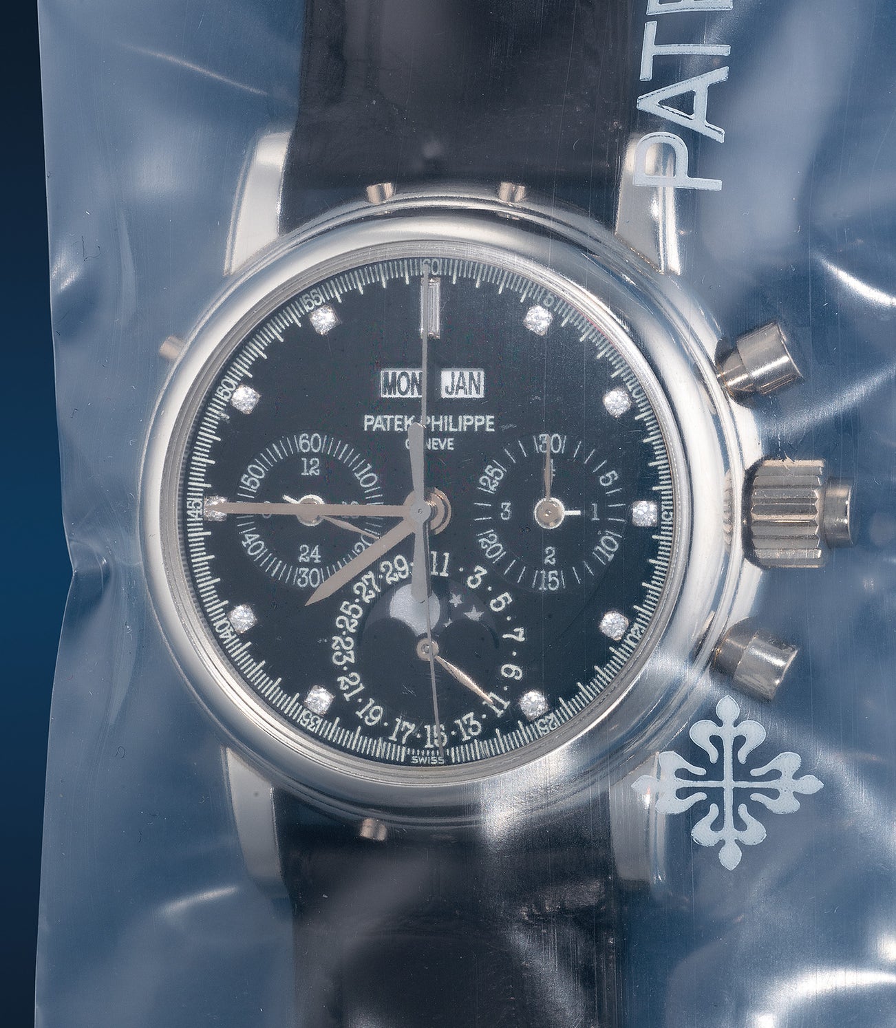 百達翡麗,型號5004P-033,極度複雜罕有,鉑金追針計時萬年曆腕錶,備月相、閏年、日夜顯示,約2010年製。附原裝證書、錶盒、備用底蓋、調整筆—單封品