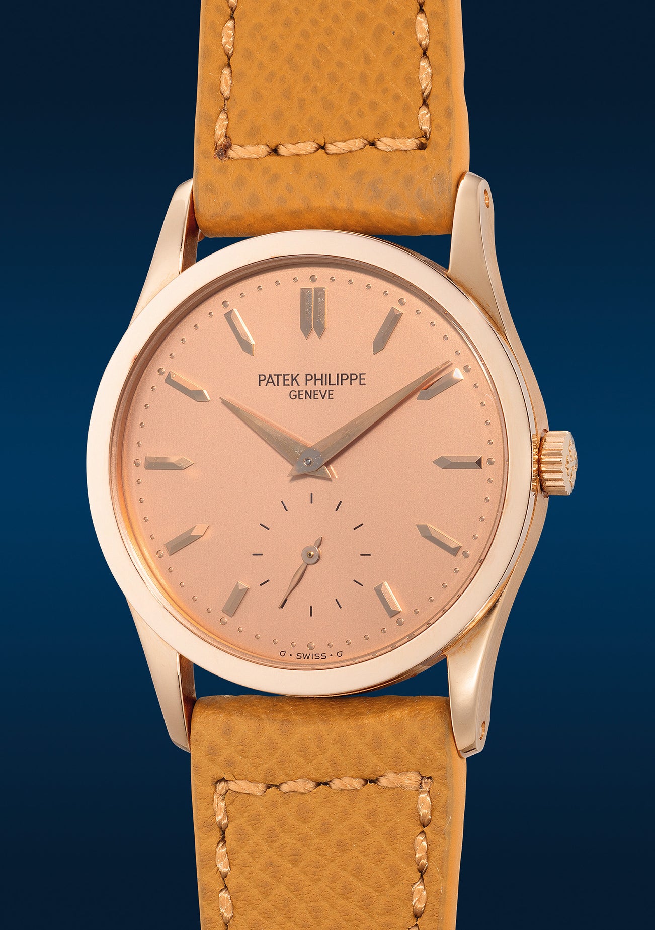 The well-preserved pink gold case matches the charming pink gold Sigma dial in perfect harmony. Together with the pink gold dauphine hands and pink gold applied baton hour markers on top, a sense of depth is added to layout and the overall design emanates supreme elegance. The present watch is powered by the caliber 215, a successor introduced in 1974 to the calibre 12-120 and a staple movement in the Calatrava collection.